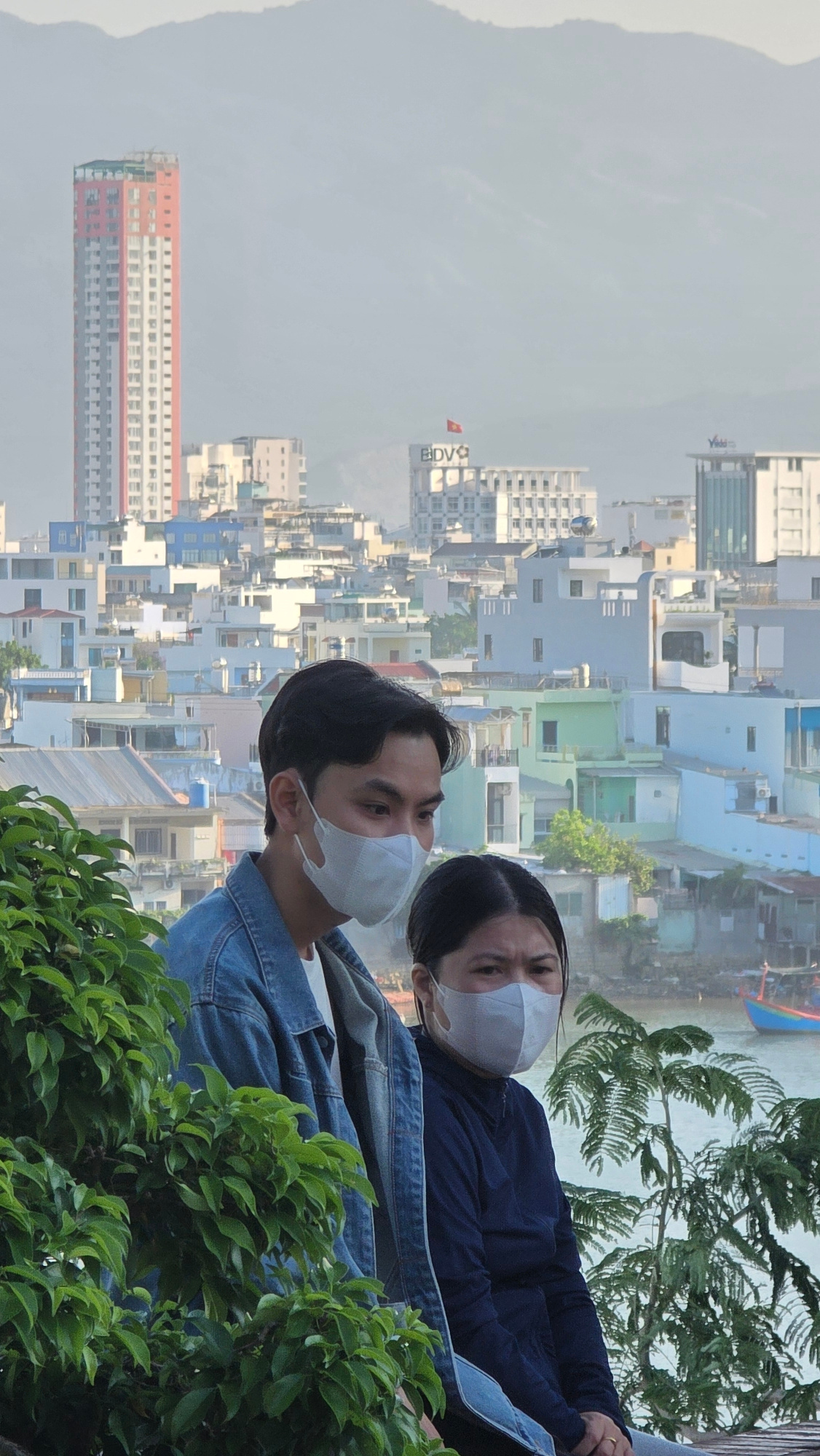 Two individuals wearing face masks are positioned in the foreground, while a dense urban landscape stretches out behind them. The city, identified as Nha Trang, Vietnam, is characterized by its divers…read more