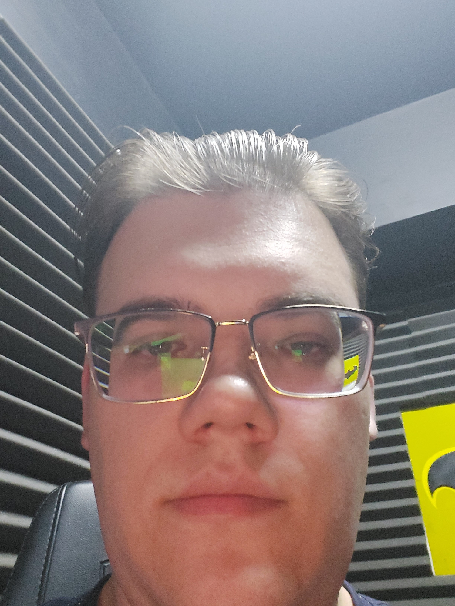 A close-up, slightly angled selfie of a fair-skinned person wearing eyeglasses. The background consists of parallel, dark-colored slats, possibly part of a ceiling or wall structure, and a brighter ar…read more