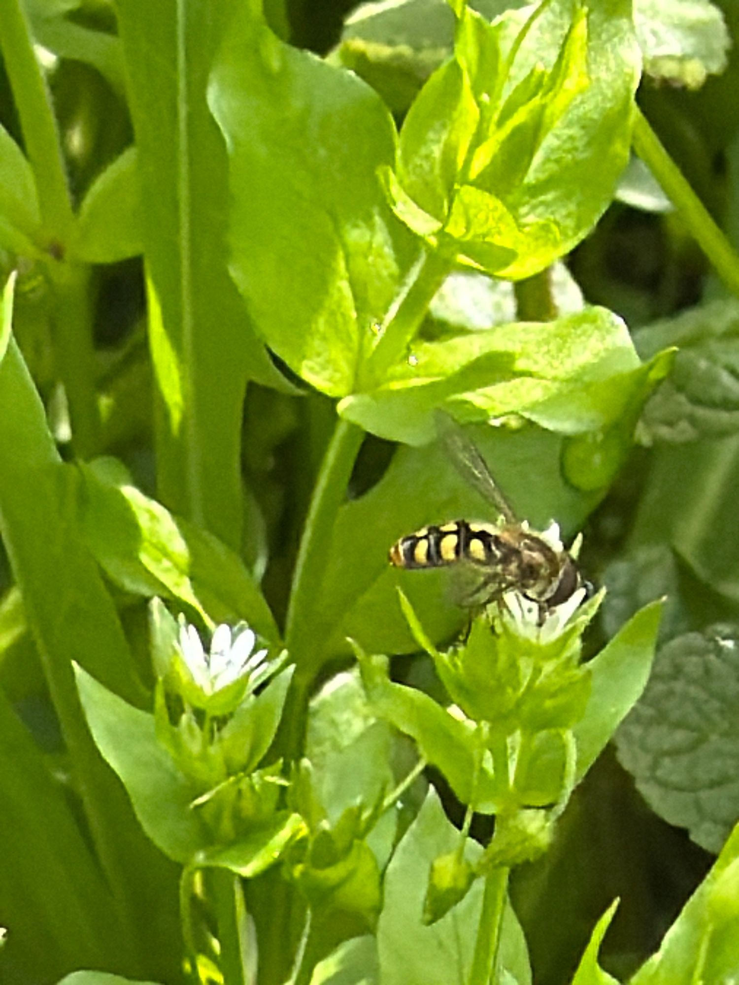 A hoverfly, with black and yellow stripes on its abdomen, is perched on a small white flower surrounded by green foliage. The scene appears to be outdoors in a natural setting. There is no specific in…read more