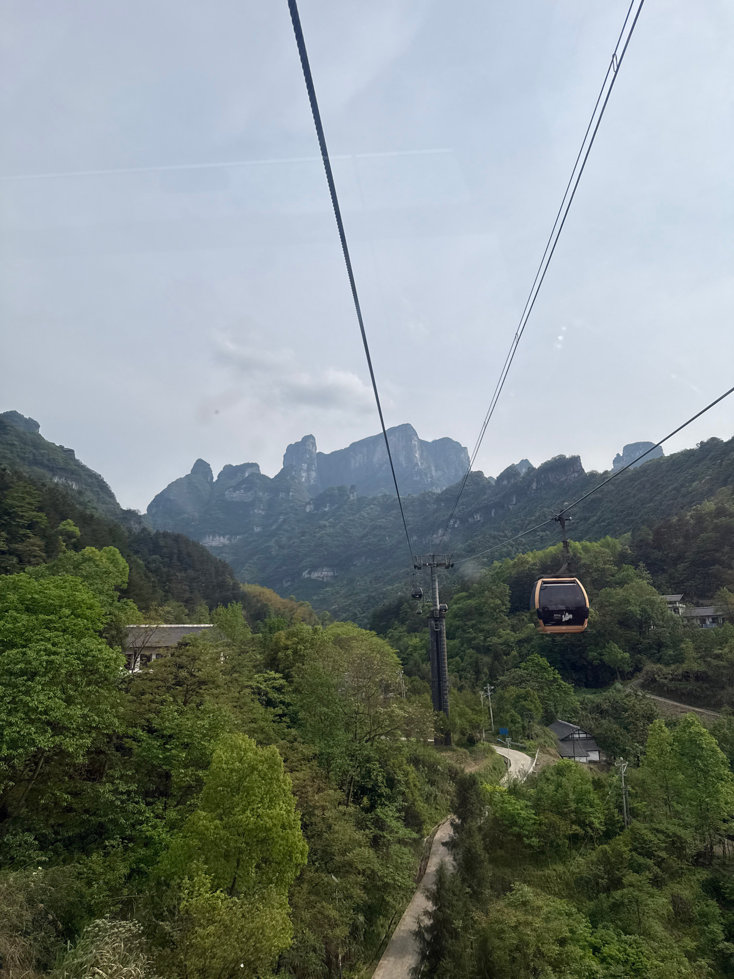 The image shows a cable car suspended high above a lush, mountainous landscape in Yongding District, China. The foreground features the cable lines leading to a tan-colored gondola moving along the ca…read more
