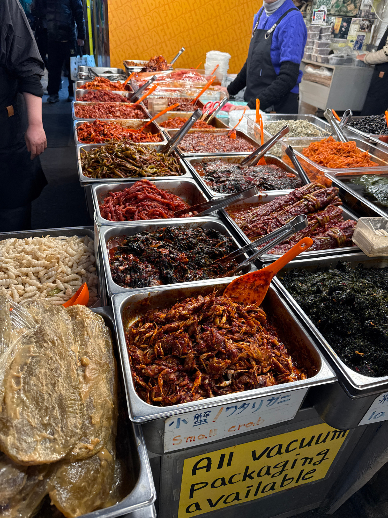 This image depicts a bustling food stall within a traditional market in Seoul, South Korea, likely Gwangjang Market or a similar establishment. The foreground is dominated by multiple rows of stainles…read more