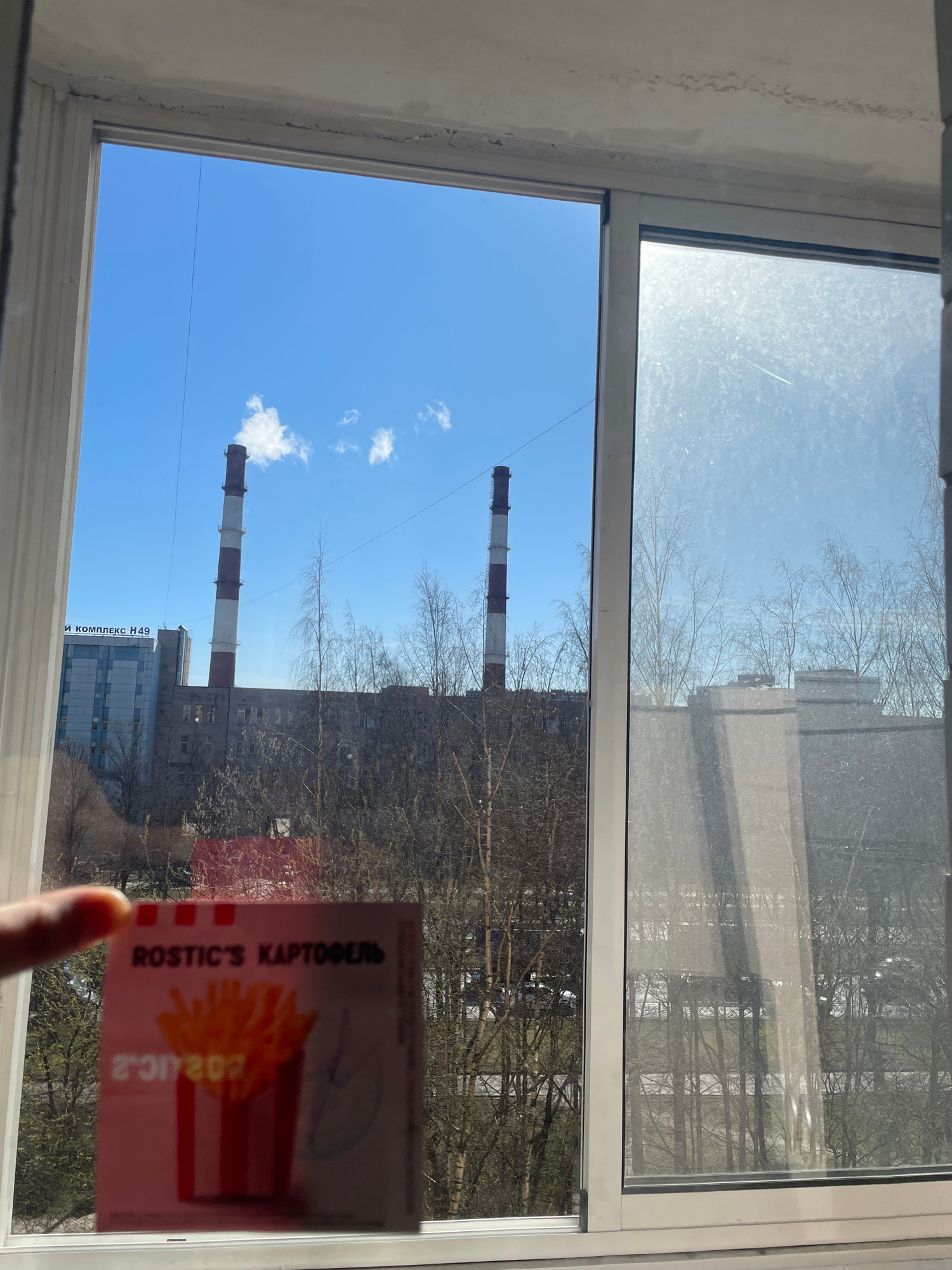 A photograph taken indoors through a window shows a clear blue sky with a few small white clouds, and two smokestacks with alternating red and white bands. A building with the inscription "И КОМПЛЕКС…read more