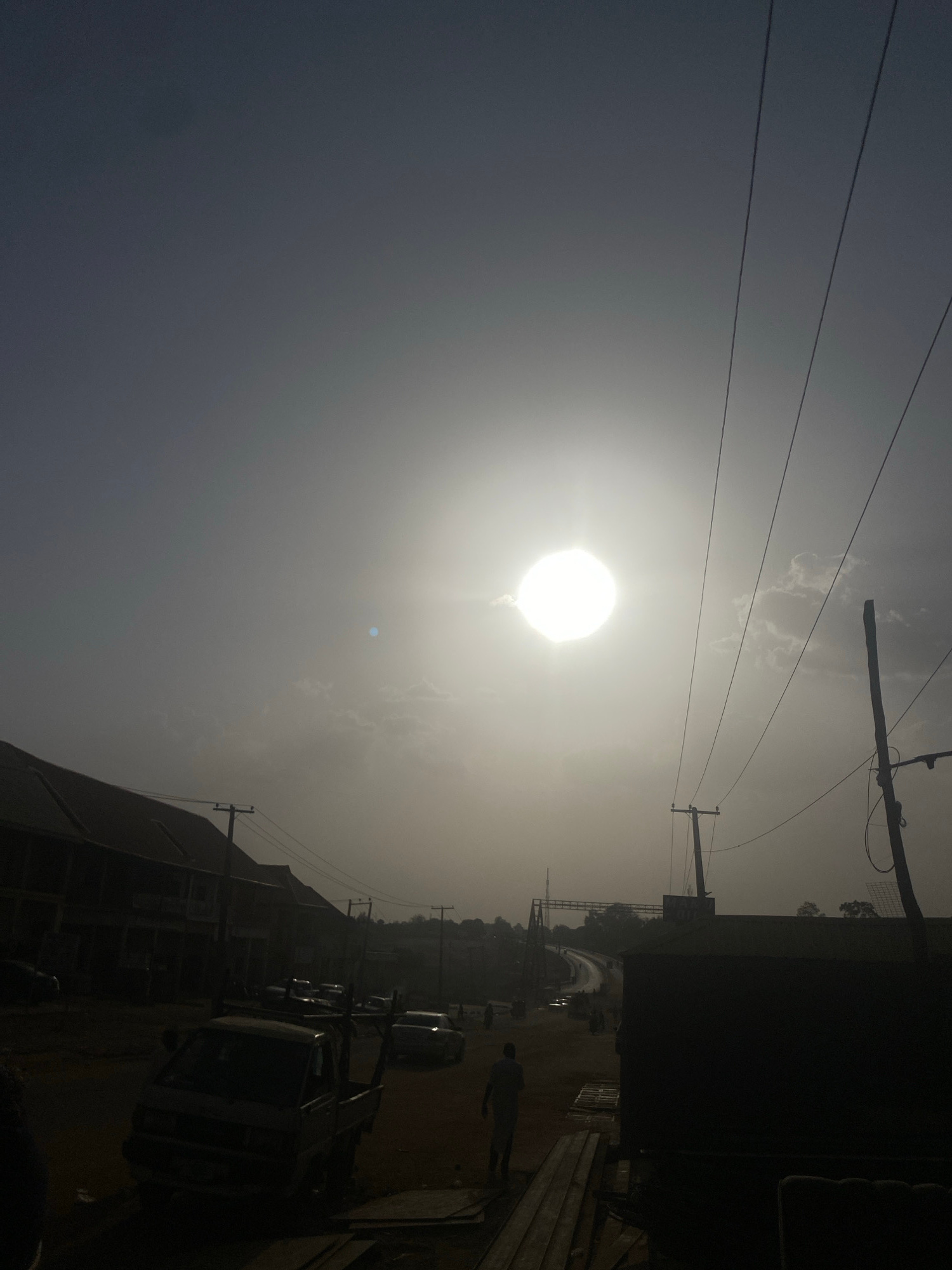 The image captures a street view in Unguwar Fatika, Nigeria, under bright sunlight. Power lines traverse the sky, connected to utility poles. Buildings line the street, with parked vehicles visible. A…read more