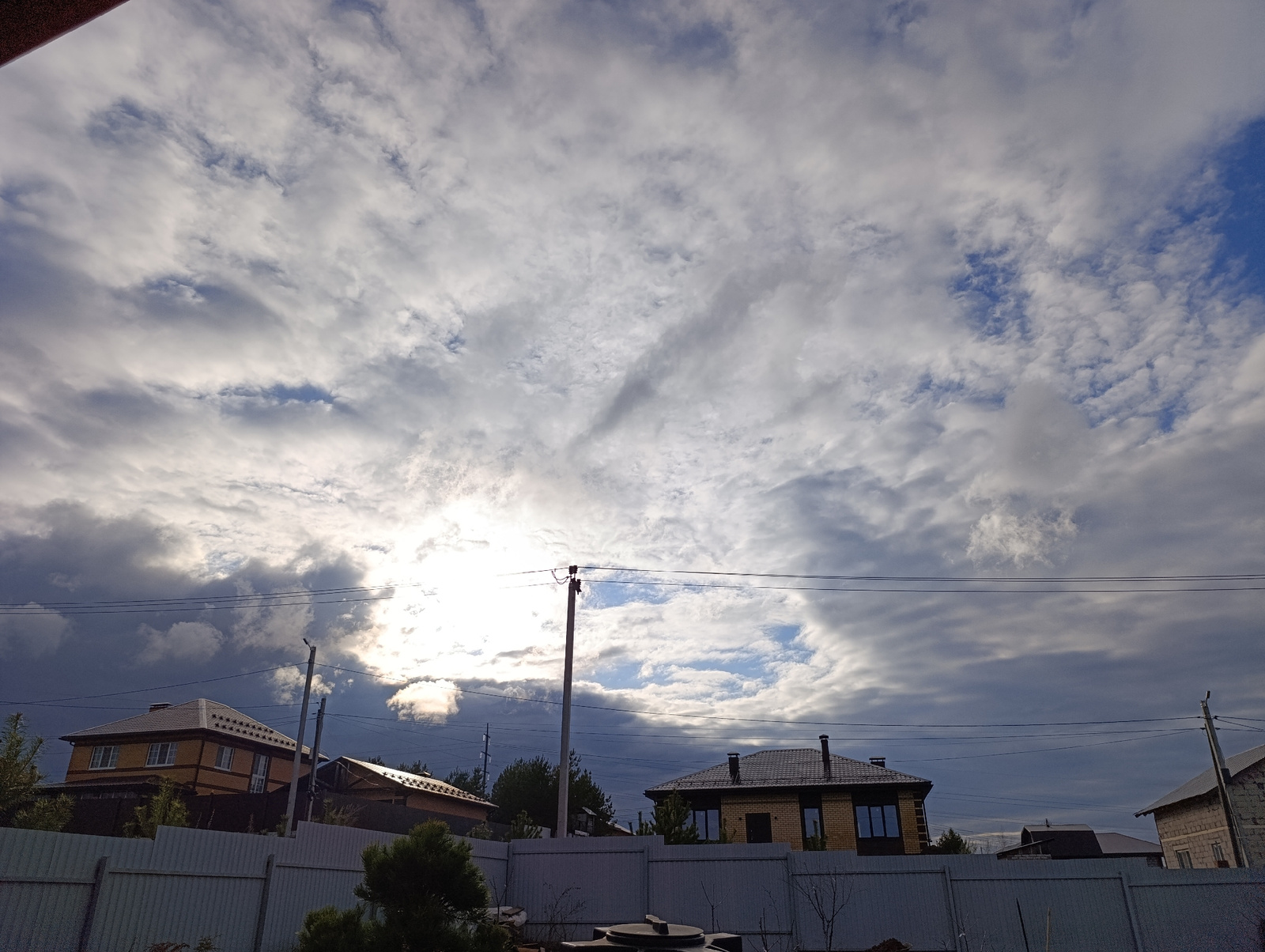 The image shows a cloudy sky over a residential area in Chaikovsky, Russia. Several houses with varied architectural styles are visible behind a grey fence. Power lines traverse the scene in the mid-g…read more