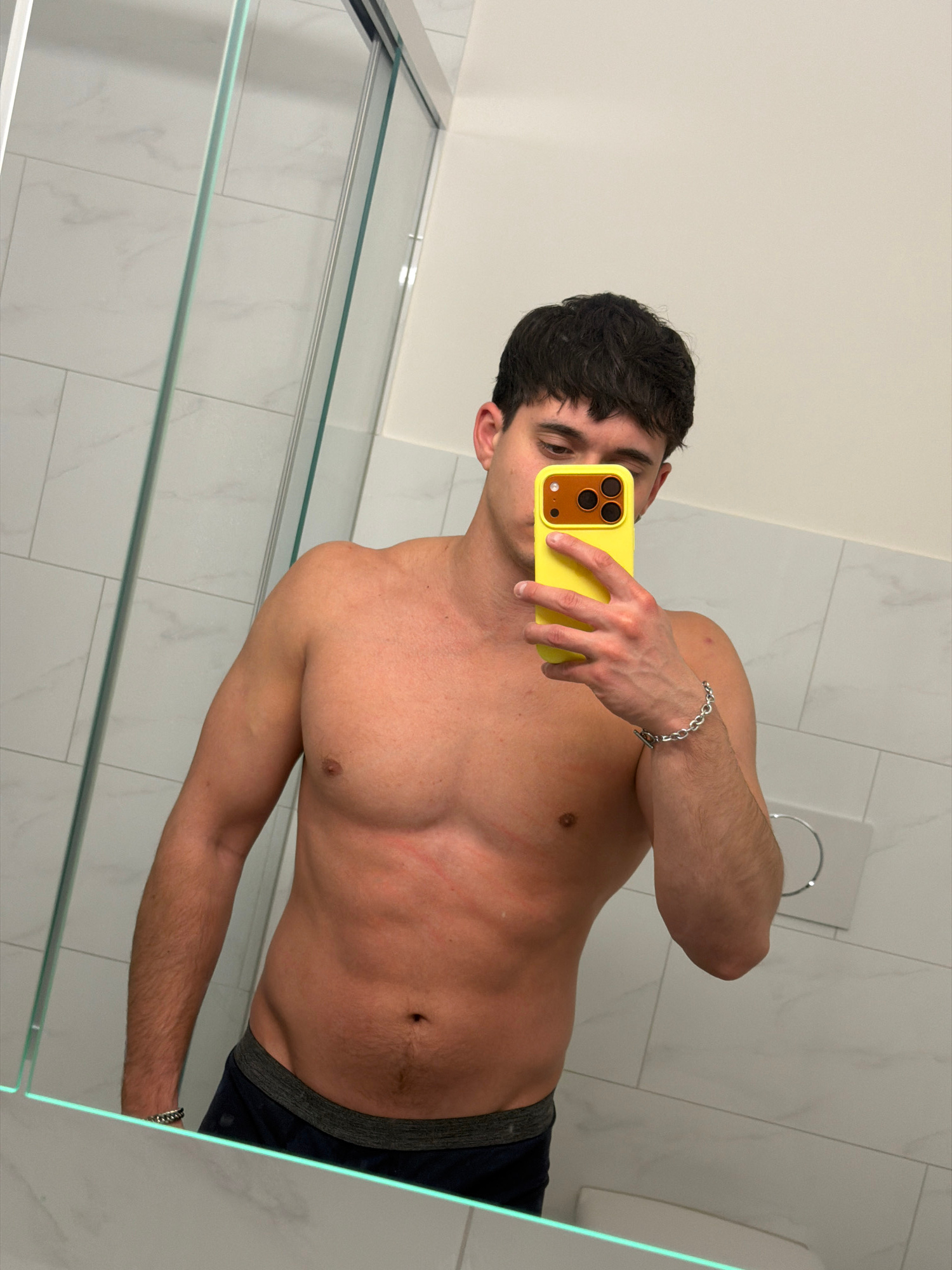 A shirtless man is taking a selfie in a bathroom with a yellow iPhone. The bathroom has white walls with marble-like tiles, a glass shower door, and a toilet paper holder. The man is wearing a silver…read more