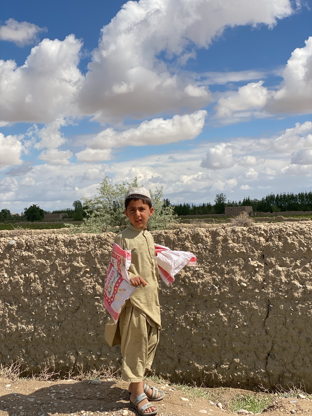 The image depicts a young boy standing outdoors in Qazi Kariz, Afghanistan. He is positioned in front of a weathered, earthen wall. The boy is wearing a traditional beige outfit and sandals, with a wh…read more
