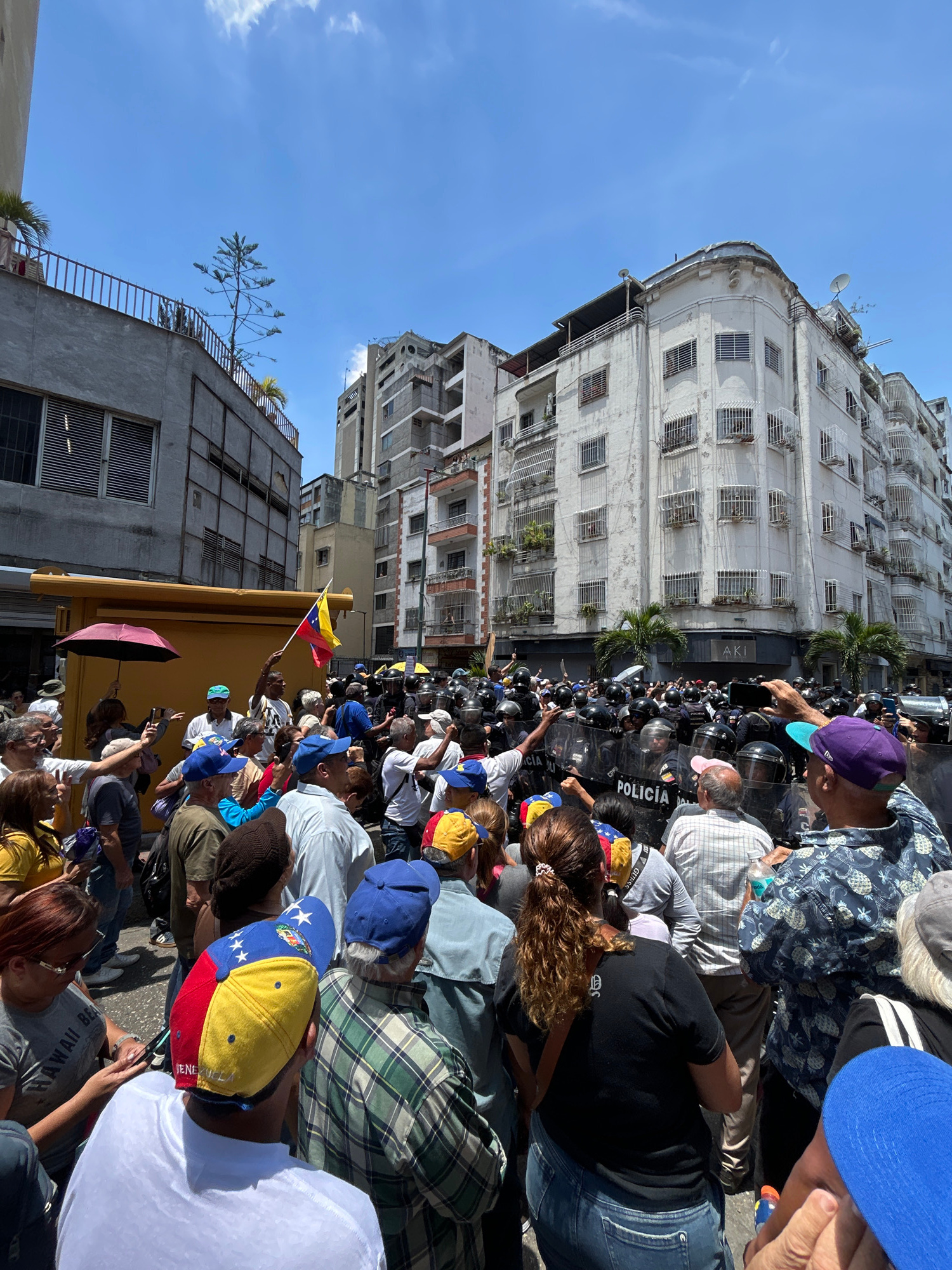A street scene in Caracas, Venezuela, shows a crowd of civilians facing a line of police in riot gear. The crowd is densely packed, with many individuals wearing hats or carrying flags displaying the…read more