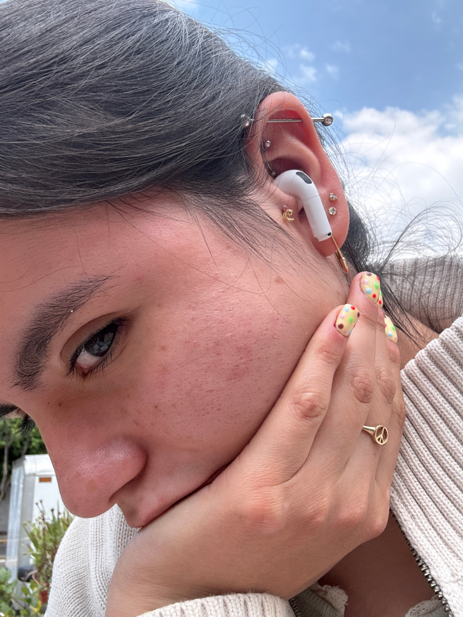 A close-up shot depicts a person with graying hair and light skin. Their left ear features multiple piercings, including a helix piercing with a barbell, two stud earrings, a tragus piercing with a cr…read more