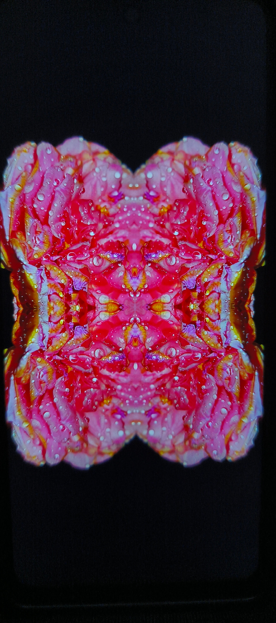 The image presents a symmetrical, abstract floral pattern dominated by shades of pink, red, yellow, and hints of purple against a stark black background. The arrangement suggests a mirrored or kaleido…read more