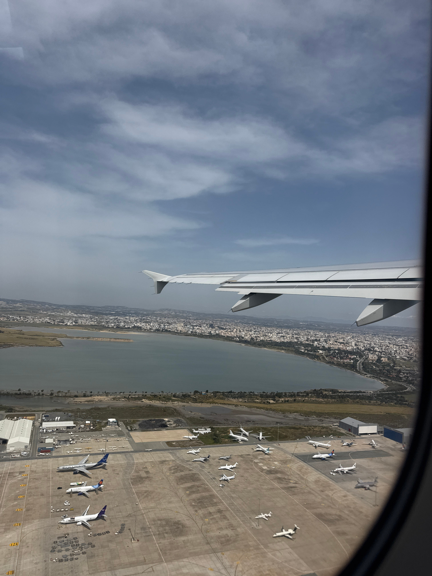 The image shows an aerial view from an airplane window, including the wing of the plane. Below, the city of Larnaca, Cyprus, is visible along the coastline of the Larnaca Salt Lake. The Larnaca Intern…read more