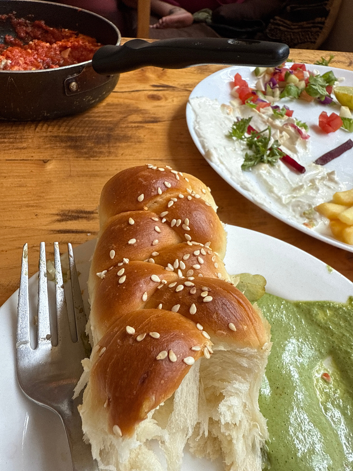 Arambol, India: A wooden table with two white plates, a frying pan, and a fork. The plate on the left contains salad, a white sauce, and french fries. The plate on the right contains braided bread wit…read more