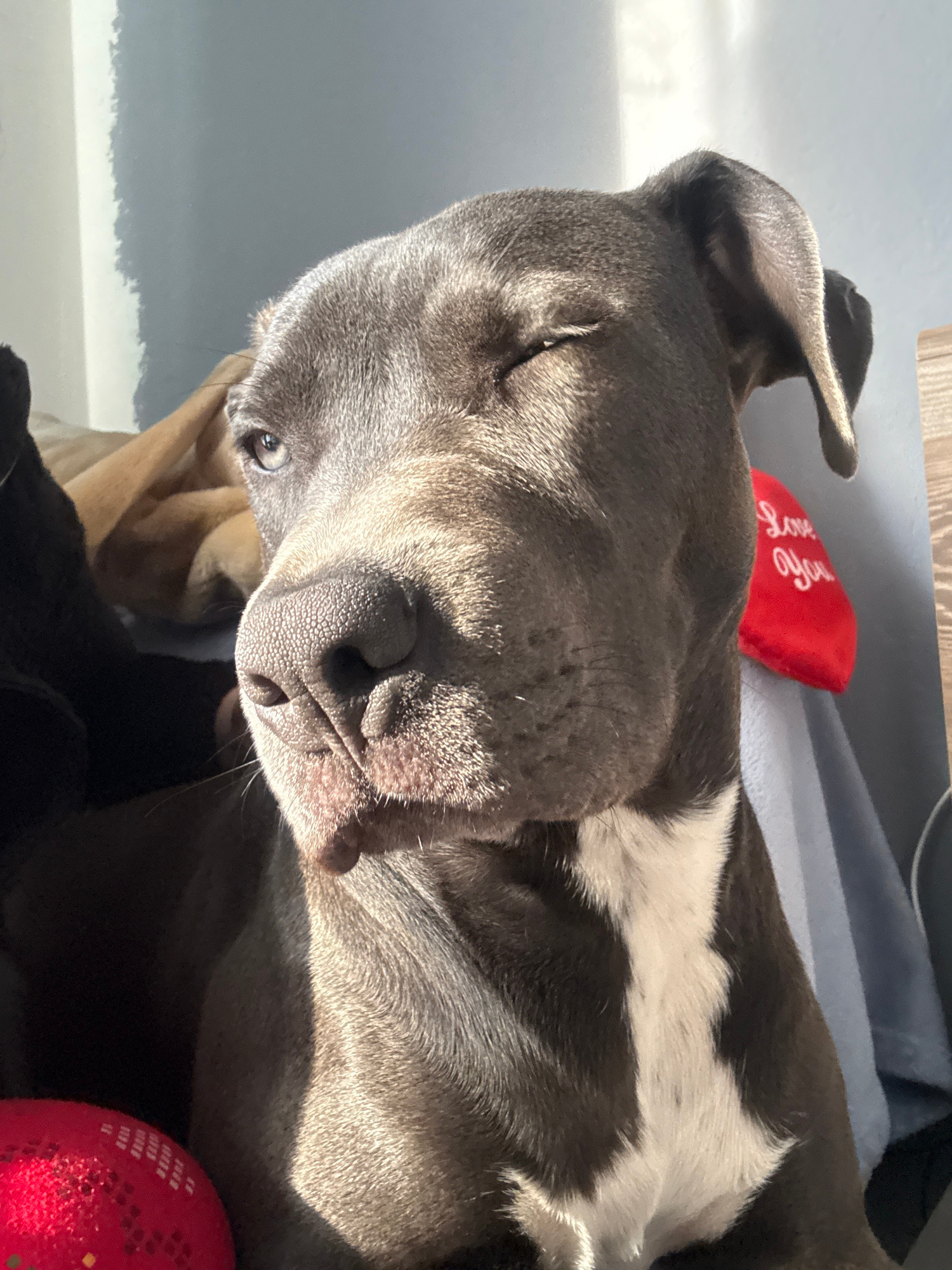 The image displays a grey-blue dog, possibly a Pitbull-type breed, sleeping soundly indoors. The dog is lying on a light blue or grey blanket, bathed in strong, directional sunlight that creates disti…read more