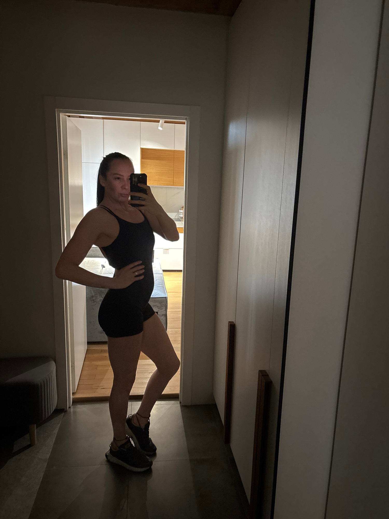 An interior mirror selfie taken in Chaikovsky, Russia, shows a woman posing in what appears to be a hallway or entrance area. The image is rotated, with the woman appearing horizontally. The main sub…read more