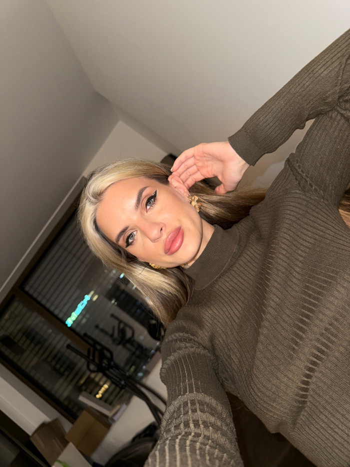 A woman with fair skin and blonde highlights poses for a selfie. She wears a ribbed, long-sleeved brown turtleneck sweater and gold floral earrings. Her makeup includes winged eyeliner and full, gloss…read more