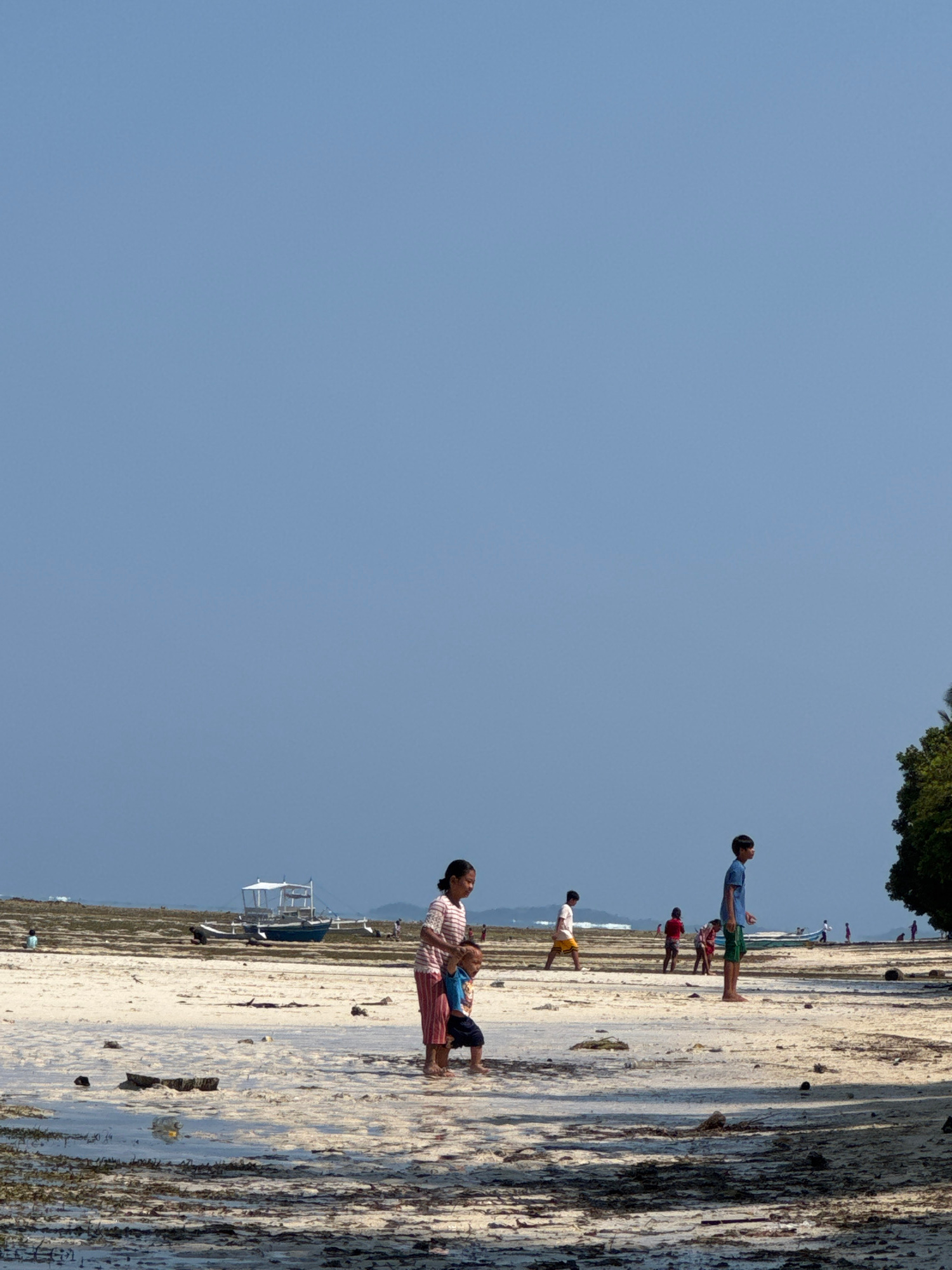 The image depicts a coastal scene in General Luna, Philippines. A beach with wet sand is prominently featured. A woman, dressed in a striped shirt and a long red and white skirt, holds a child. Severaβ¦read more