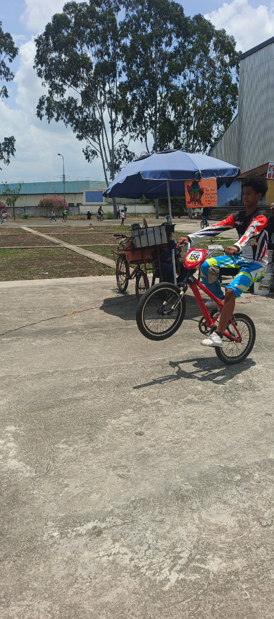 The image captures a young male in Tinaquillo, Venezuela, performing a wheelie on a red bicycle marked with the number "156." He wears a racing jersey and blue and yellow pants with white shoes. In th…read more
