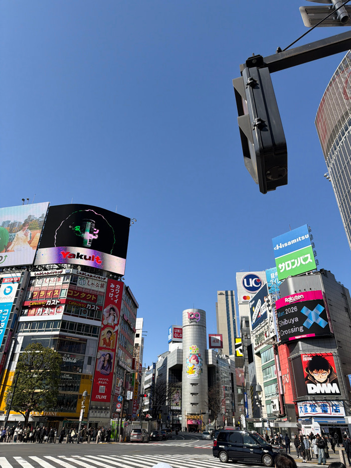 The image depicts a wide-angle view of the Shibuya Crossing in Shibuya, Tokyo, Japan, under a clear blue sky. The scene is dominated by a dense arrangement of multi-story commercial buildings adorned…read more