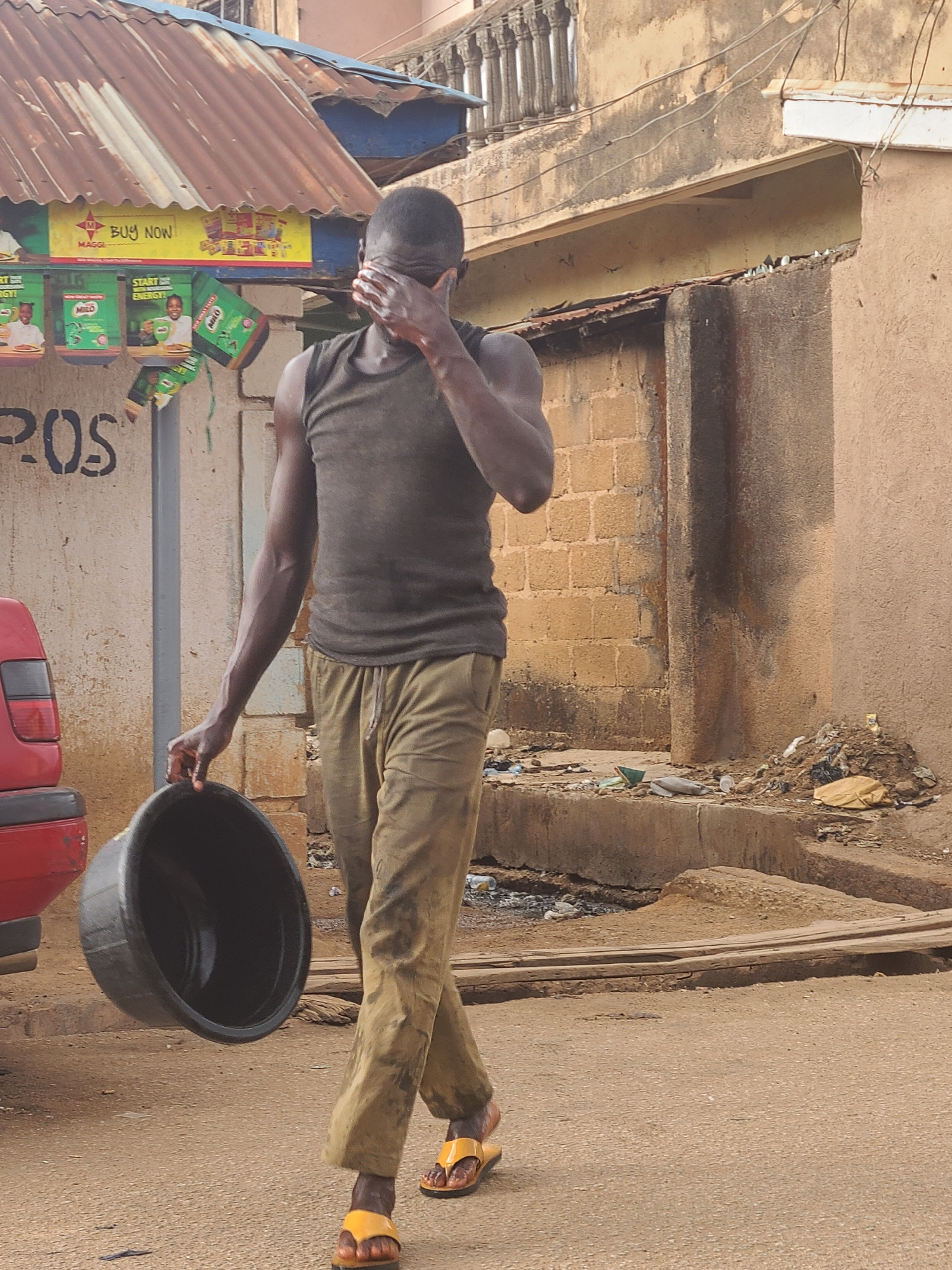 A man stands on a street in Jos, Nigeria. He is wearing a dark tank top and light brown pants with yellow sandals. He is holding a black bucket in his left hand and covering his face with his right ha…read more