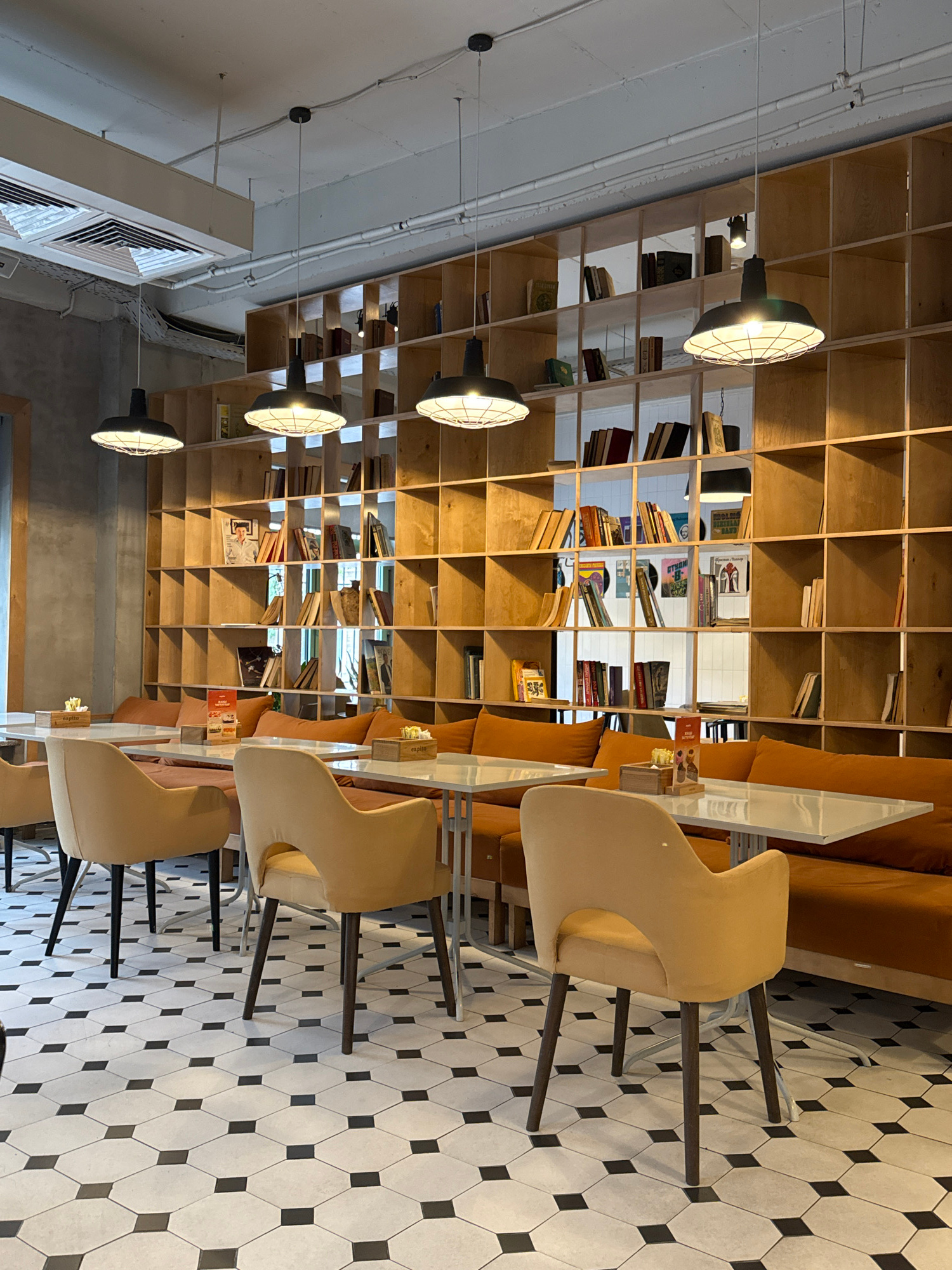 The image shows the interior of a cafe or similar establishment, likely in Bishkek City, Kyrgyzstan, given the prompt's context. The layout features tables with transparent tops and light beige chairsβ¦read more
