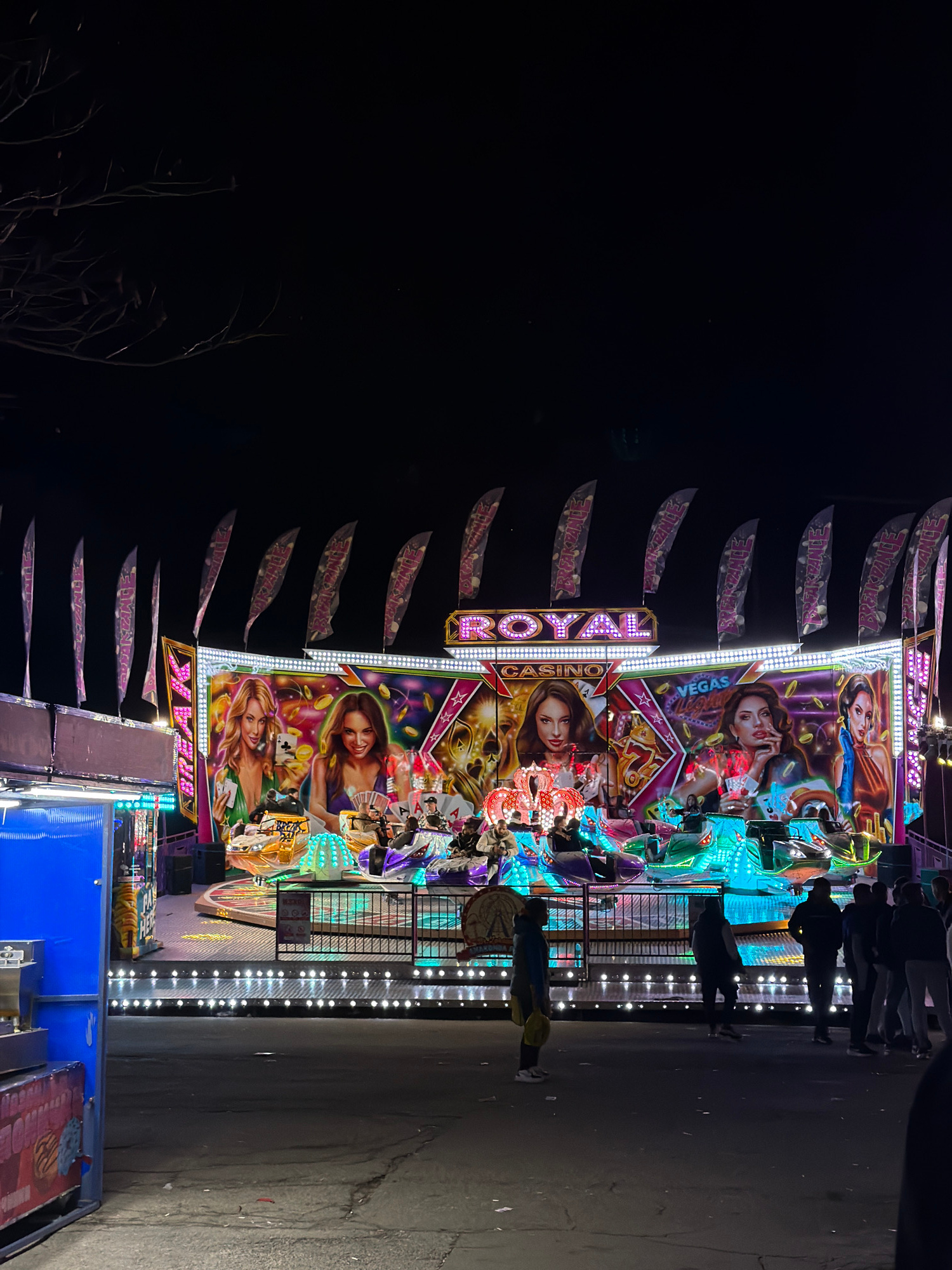 At night, a vibrant fairground attraction, a "Royal Casino Vegas Break Dance" ride, stands illuminated. The ride is decorated with images of glamorous women and gambling motifs. People are waiting to…read more