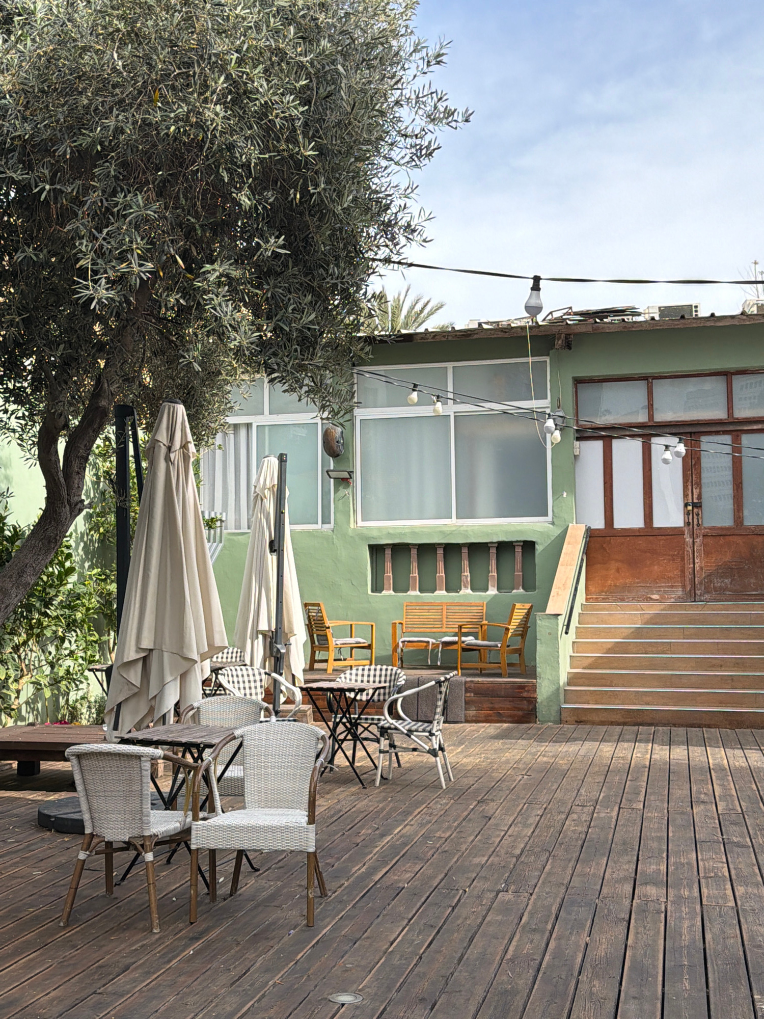 The image shows an outdoor cafe setting, likely in Tel Aviv, Israel. The scene features a wooden deck with tables and chairs, partially shaded by closed umbrellas. A mature tree with dense foliage sta…read more