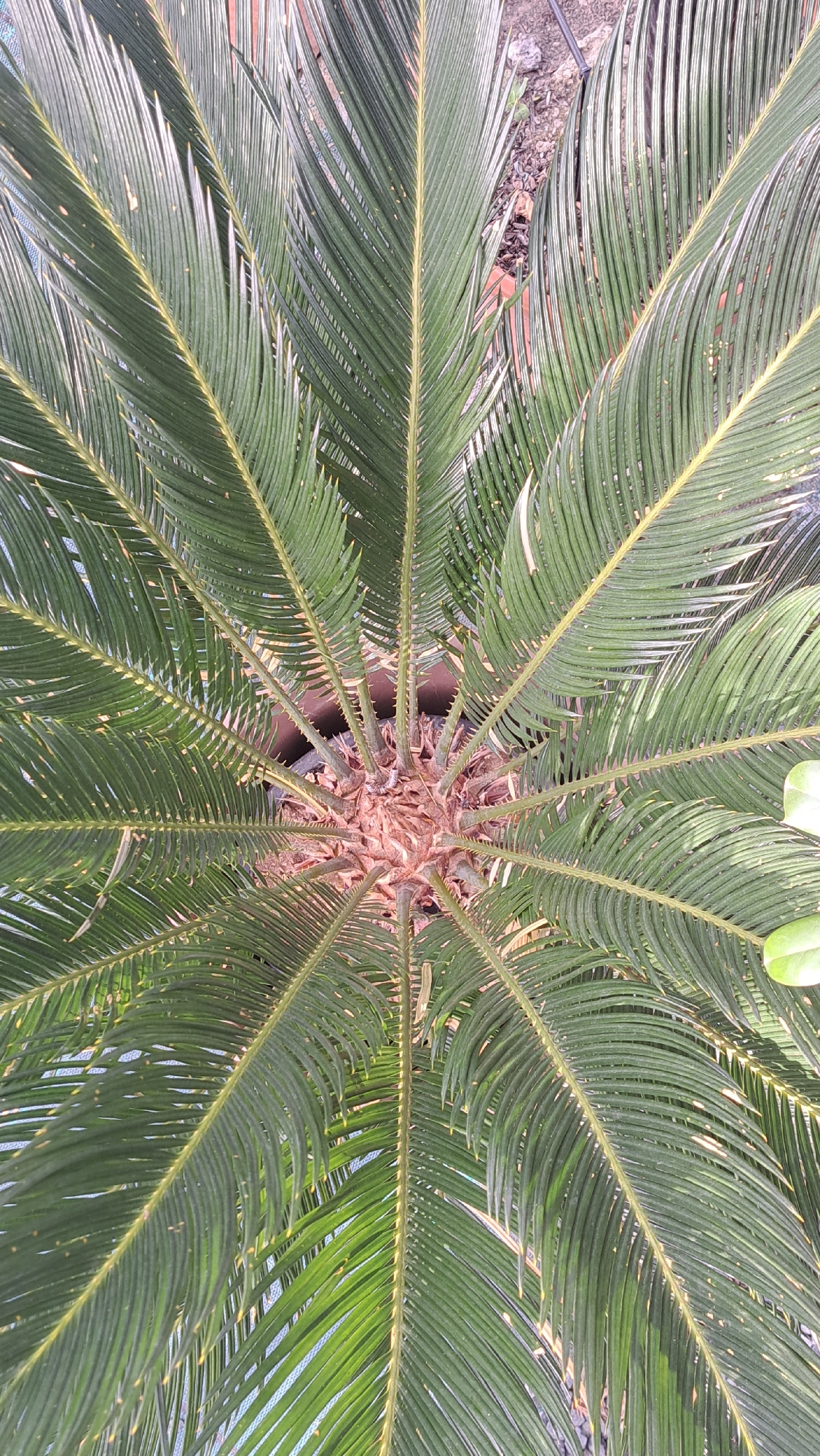 The image is a top-down view of a Sago Palm, likely taken in Stara Zagora, Bulgaria. The palm's green fronds radiate outwards from a central, brown-colored trunk. The surrounding environment consists…read more