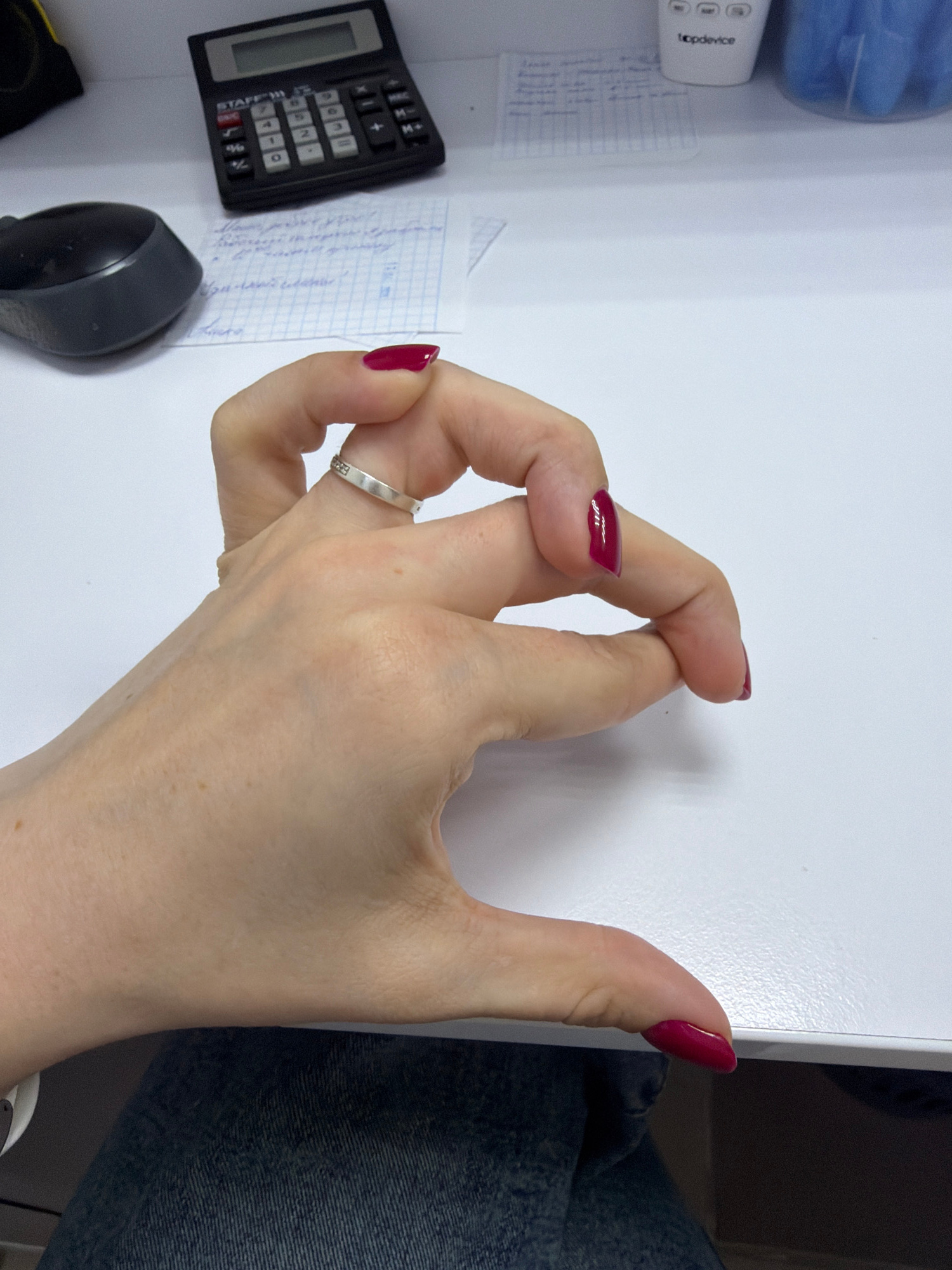 A right hand with a silver ring on the ring finger is held against a white surface, possibly a desk. The nails are painted a dark red color. The index and middle fingers are bent, touching at the fing…read more