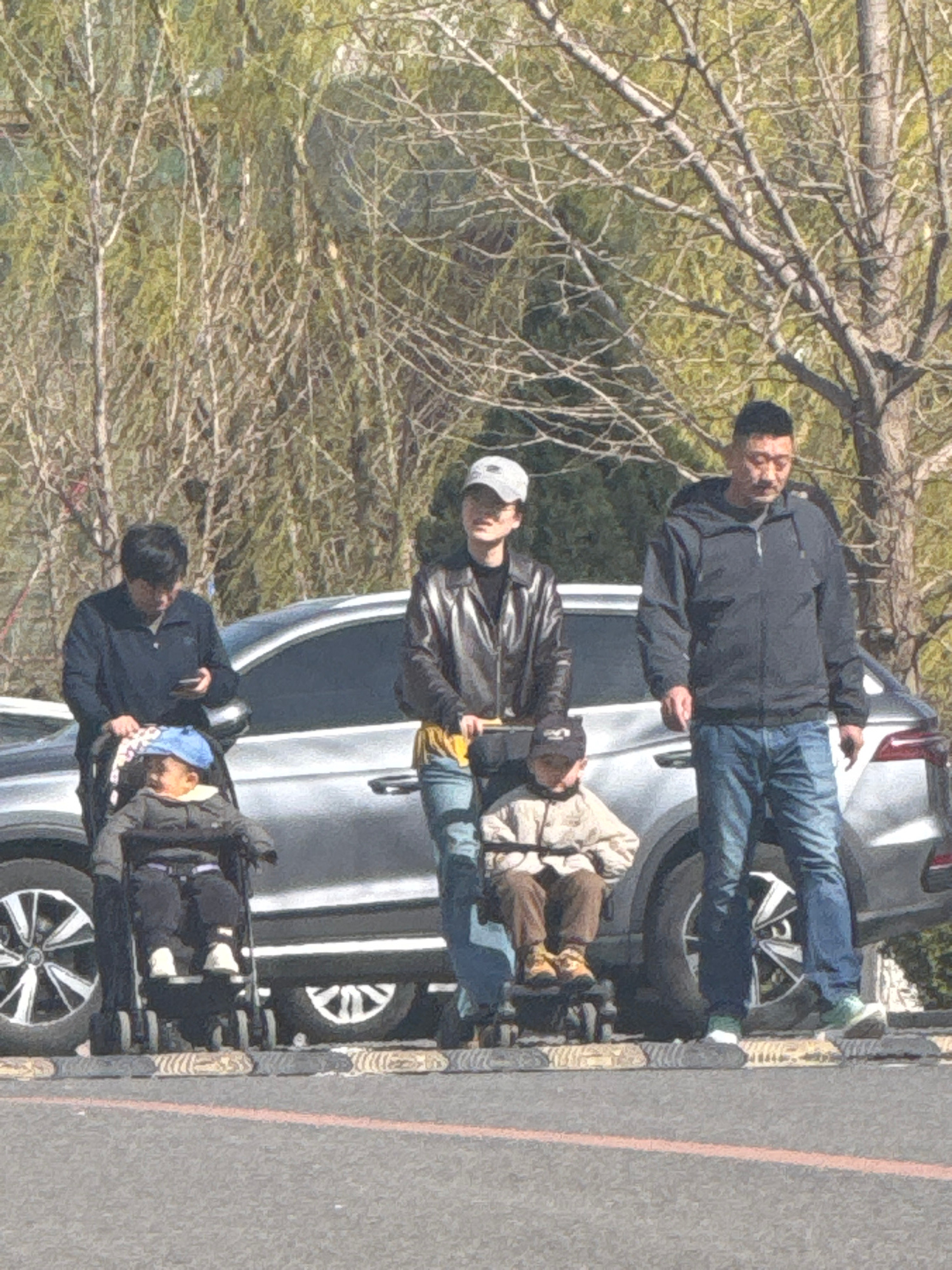 In Zhongtun, China, a family of three adults and two children are near a parked silver SUV on a sunny day. An older man in a black jacket and jeans stands by the rear tire. A younger man in a leather…read more