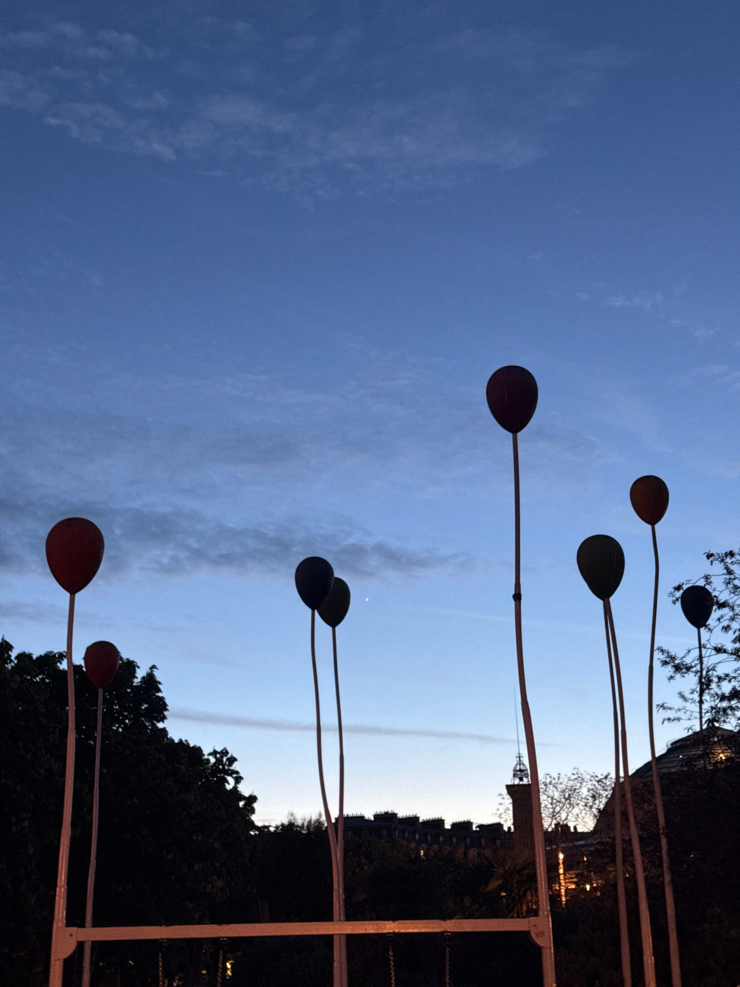The image depicts a sculpture in Paris against a backdrop of a blue sky with wispy clouds. The sculpture appears to be a series of tall, thin poles with round, paddle-like shapes at the top, resemblin…read more