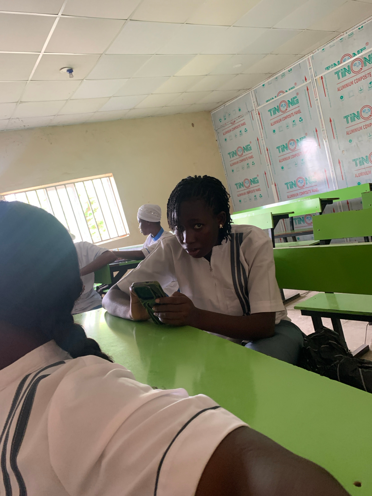 The image shows an indoor scene in what appears to be a school cafeteria or dining hall in Keffi, Nigeria. Several students are seated at long, green tables with attached benches. The students are wea…read more
