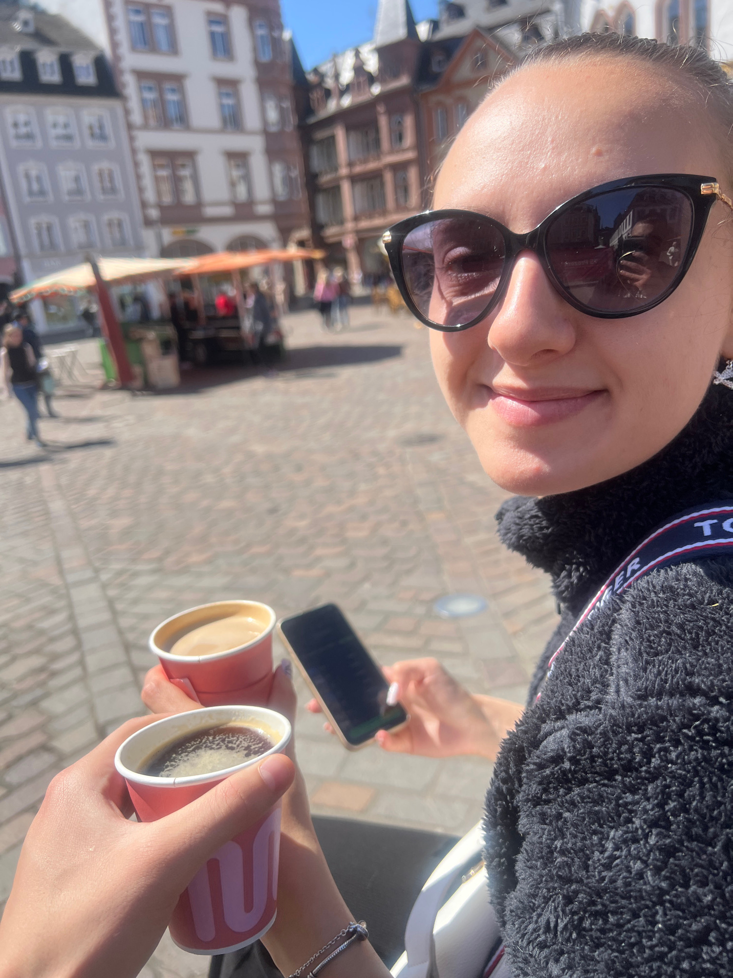 A woman wearing sunglasses and a black Tommy Hilfiger fleece jacket takes a selfie while holding two cups of coffee on a paved street in Trier, Germany. The coffee cups are pink and white. Another per…read more