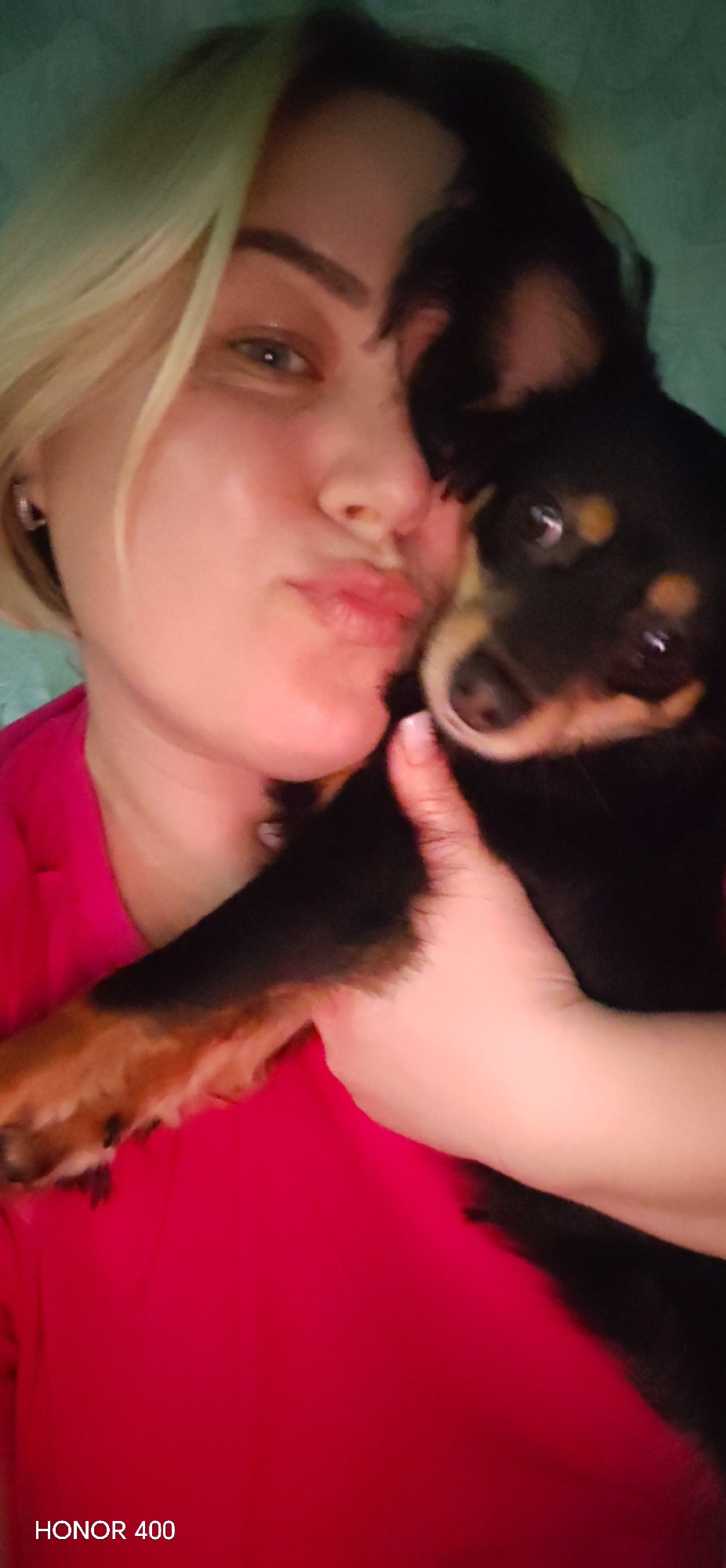 A woman with blonde hair and a red shirt holds a black and brown puppy. The woman is pursing her lips. The location may be Noviy, Russia. The photo appears to have been taken indoors and the words "HO…read more