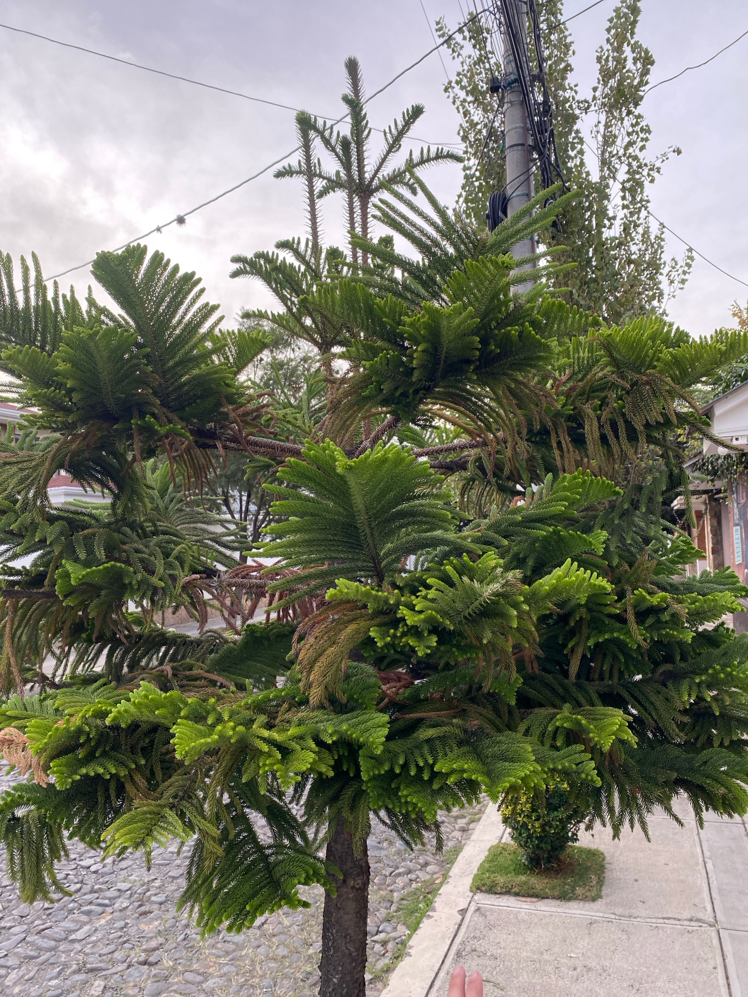The image displays a vibrant evergreen tree, possibly a Norfolk Island Pine, with dense, fern-like foliage, ranging from bright light green new growth to darker, older fronds. The tree occupies the ma…read more
