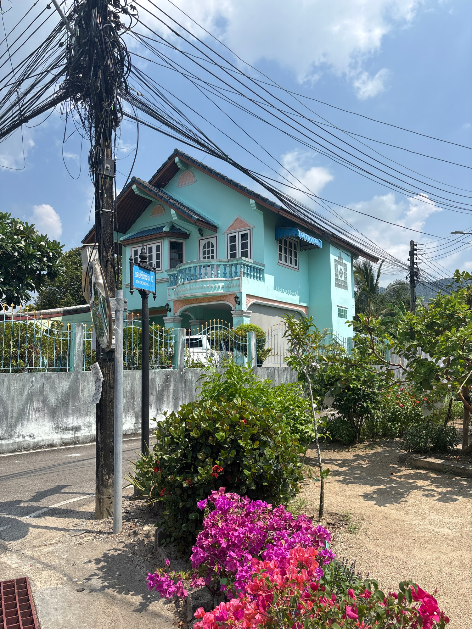 An outdoor, daytime photograph showcases a vibrant street scene in Choeng Thale, Thailand. The primary subject is a two-story house painted in a distinctive turquoise or light blue hue, featuring whit…read more