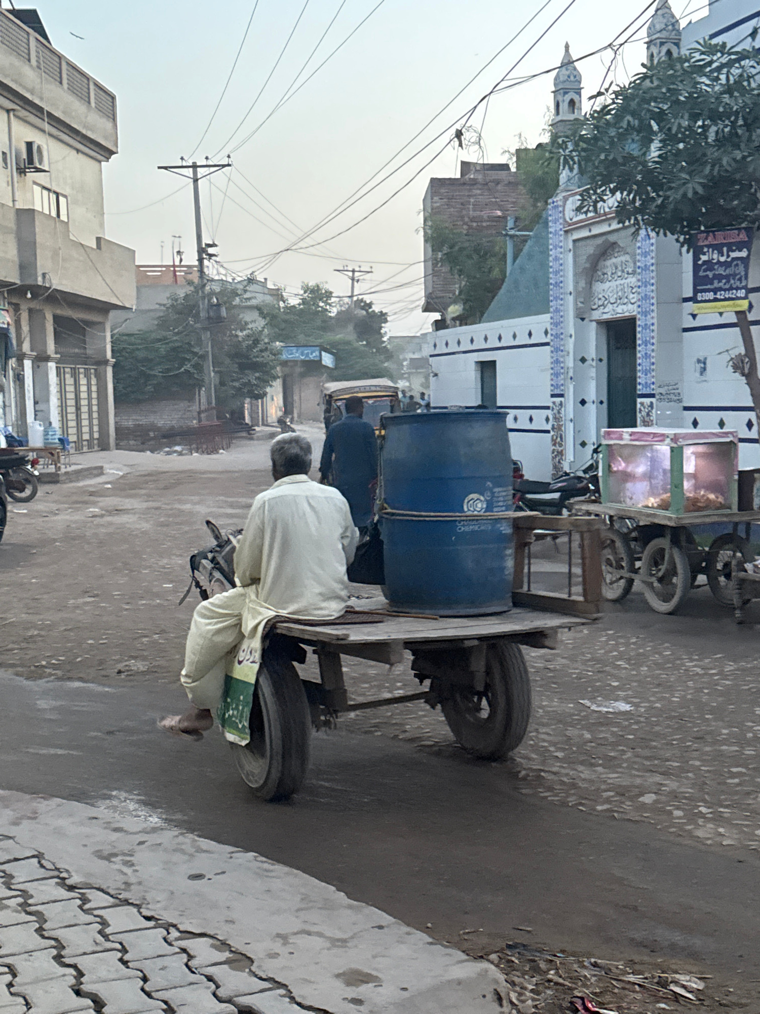 The image, taken in Nasheman Colony, Pakistan, shows a man riding a motorcycle with a makeshift trailer. The trailer carries a blue plastic barrel strapped with rope, likely for transporting liquids.…read more