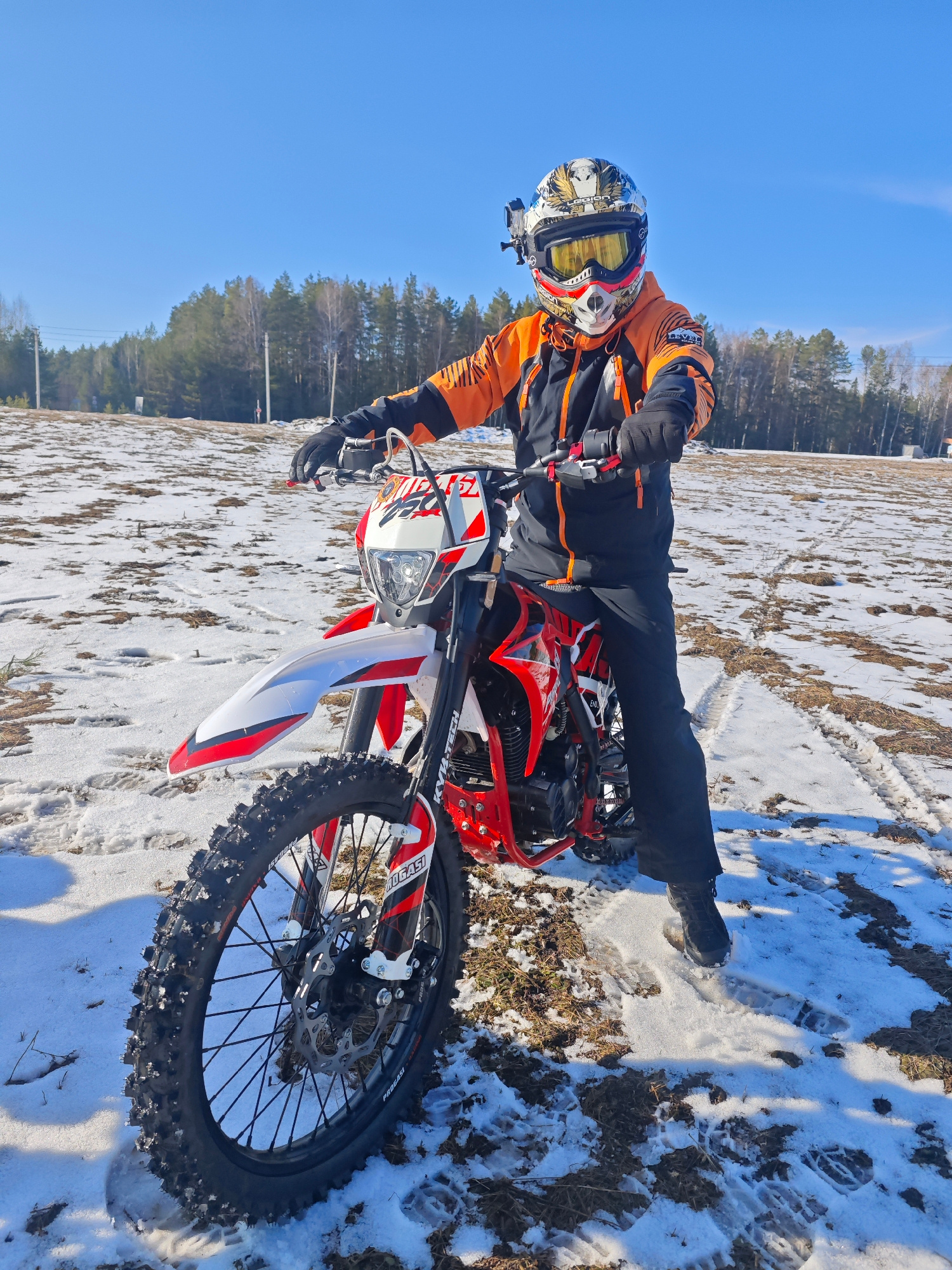 The image shows a person on a red and white dirt bike in a snowy field. The person is wearing a helmet with goggles, an orange and black jacket, and black pants. The field is covered with patches of s…read more