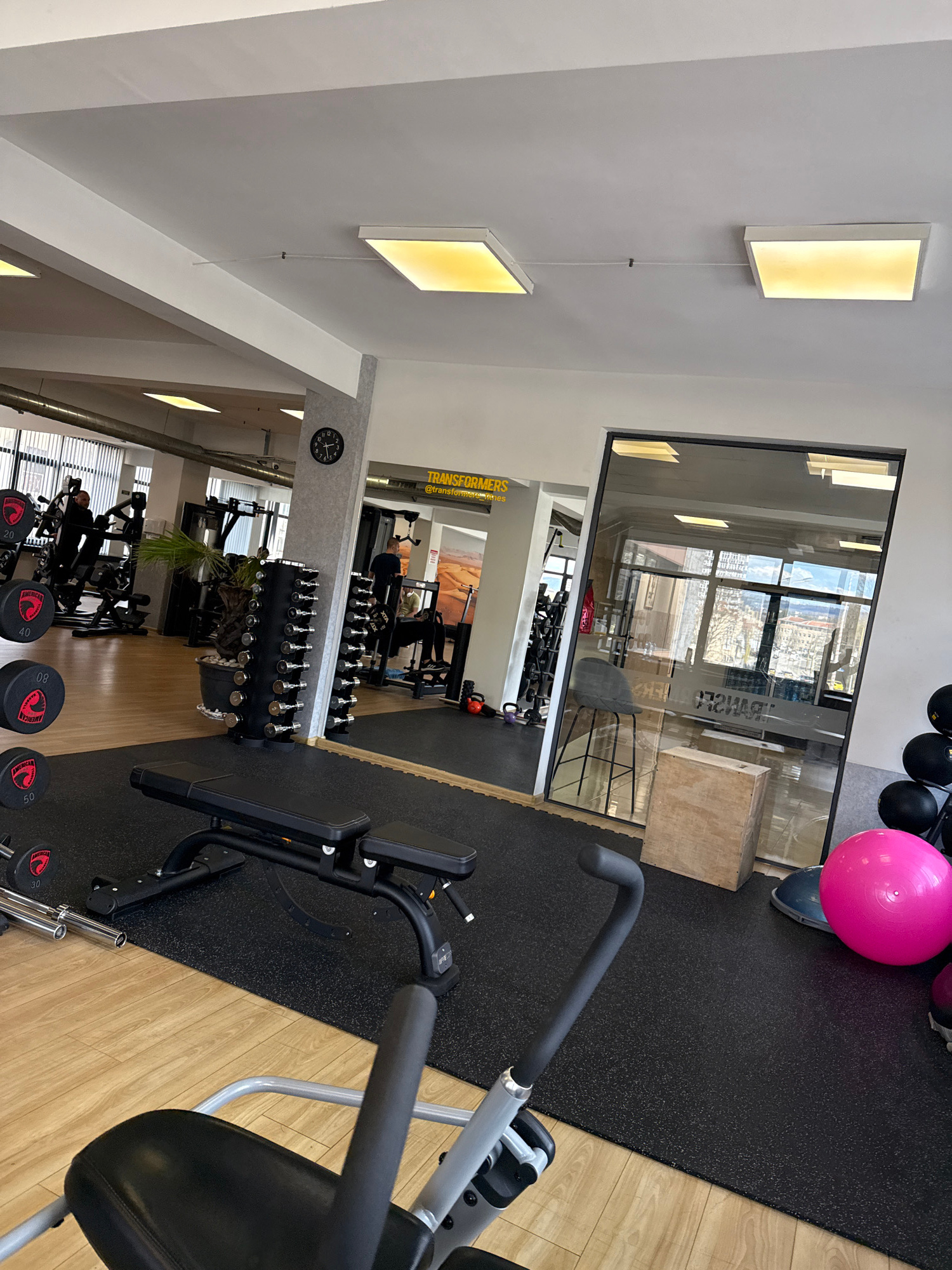 The image depicts the interior of a gym in Gabrovo, Bulgaria. The space is well-lit with rectangular wall-mounted lights. There is a large glass partition separating two sections of the gym, visible i…read more