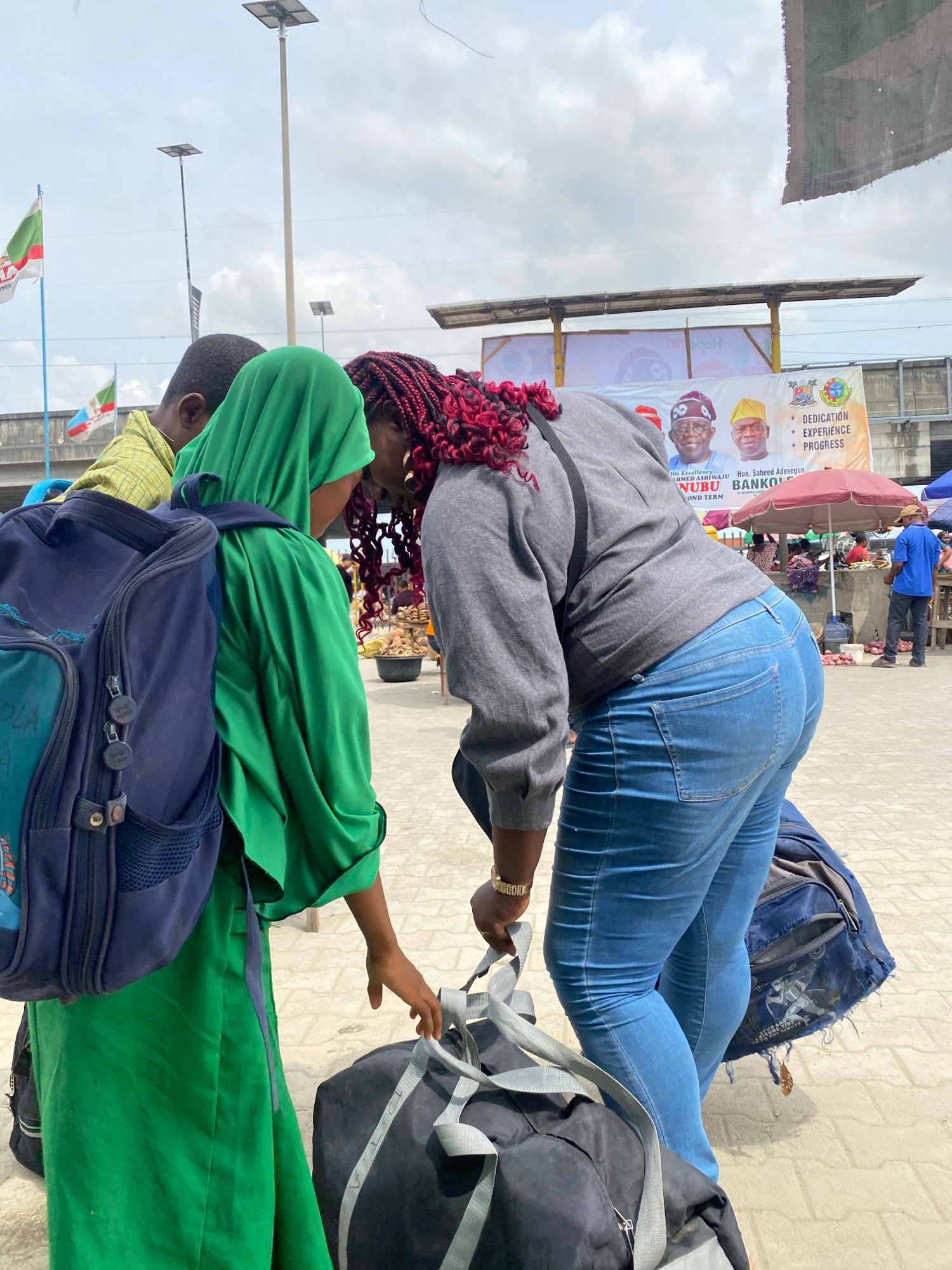 The image depicts an active street scene in Lekki, Nigeria, under an overcast sky during daytime. The foreground is dominated by several individuals and their luggage, suggesting movement or travel.…read more