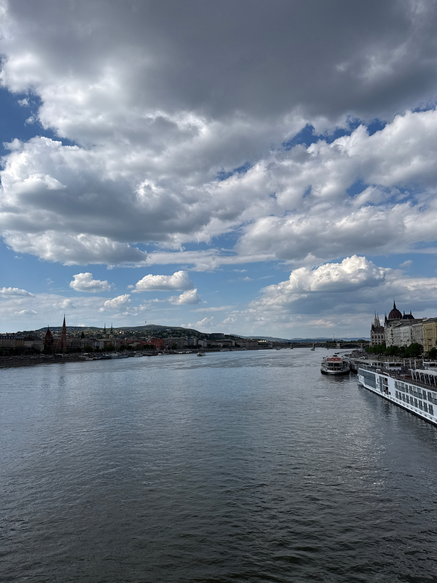 A wide, panoramic view captures a cityscape along a broad river under a partly cloudy sky. The image, originally rotated, shows a vibrant daytime scene. The sky, occupying the upper portion of the fr…read more