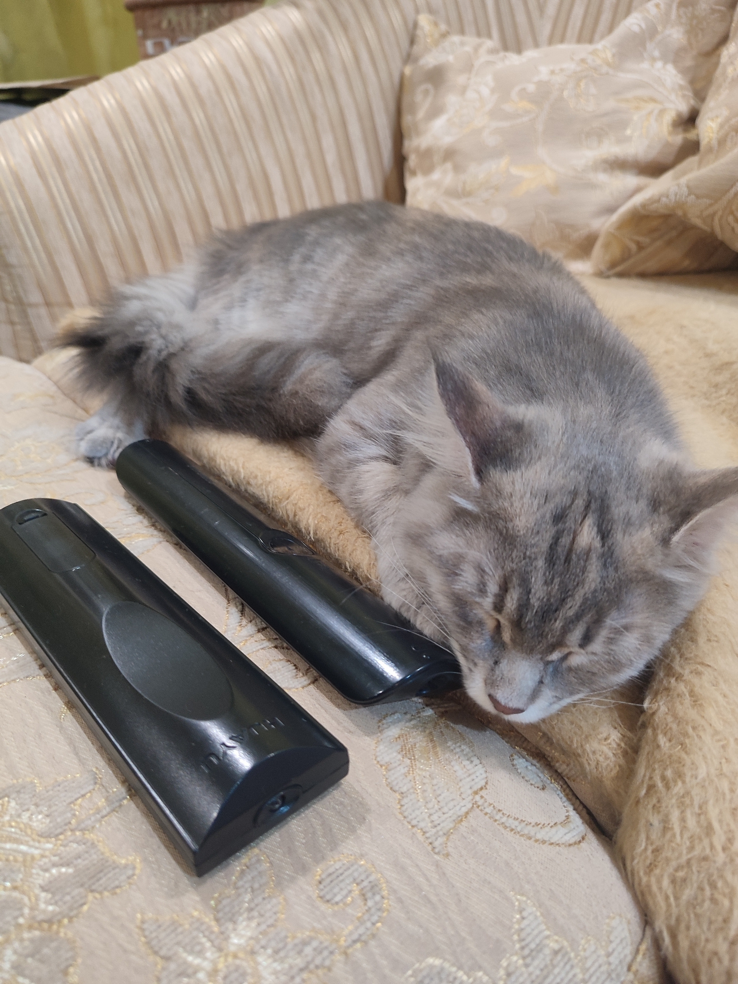A gray tabby cat is sleeping on a tan, patterned sofa next to two black remote controls. The cat is curled up, with its head resting near the remotes. The scene appears to be indoors. The location in…read more