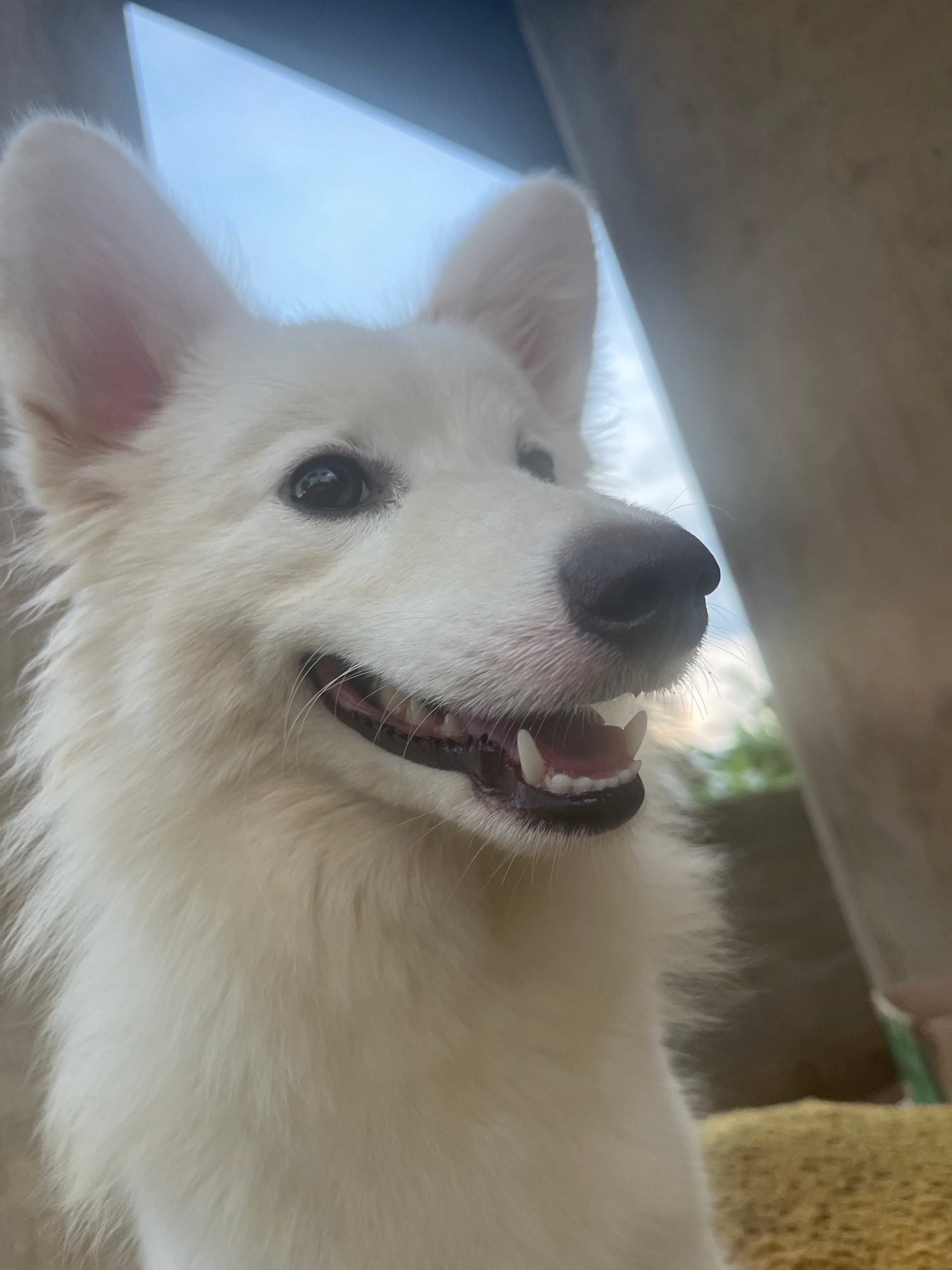 A close-up, slightly distorted photograph shows a white dog lying on its back. The dog's head is tilted upwards, revealing its teeth. The background is blurry, with glimpses of what appears to be a wa…read more