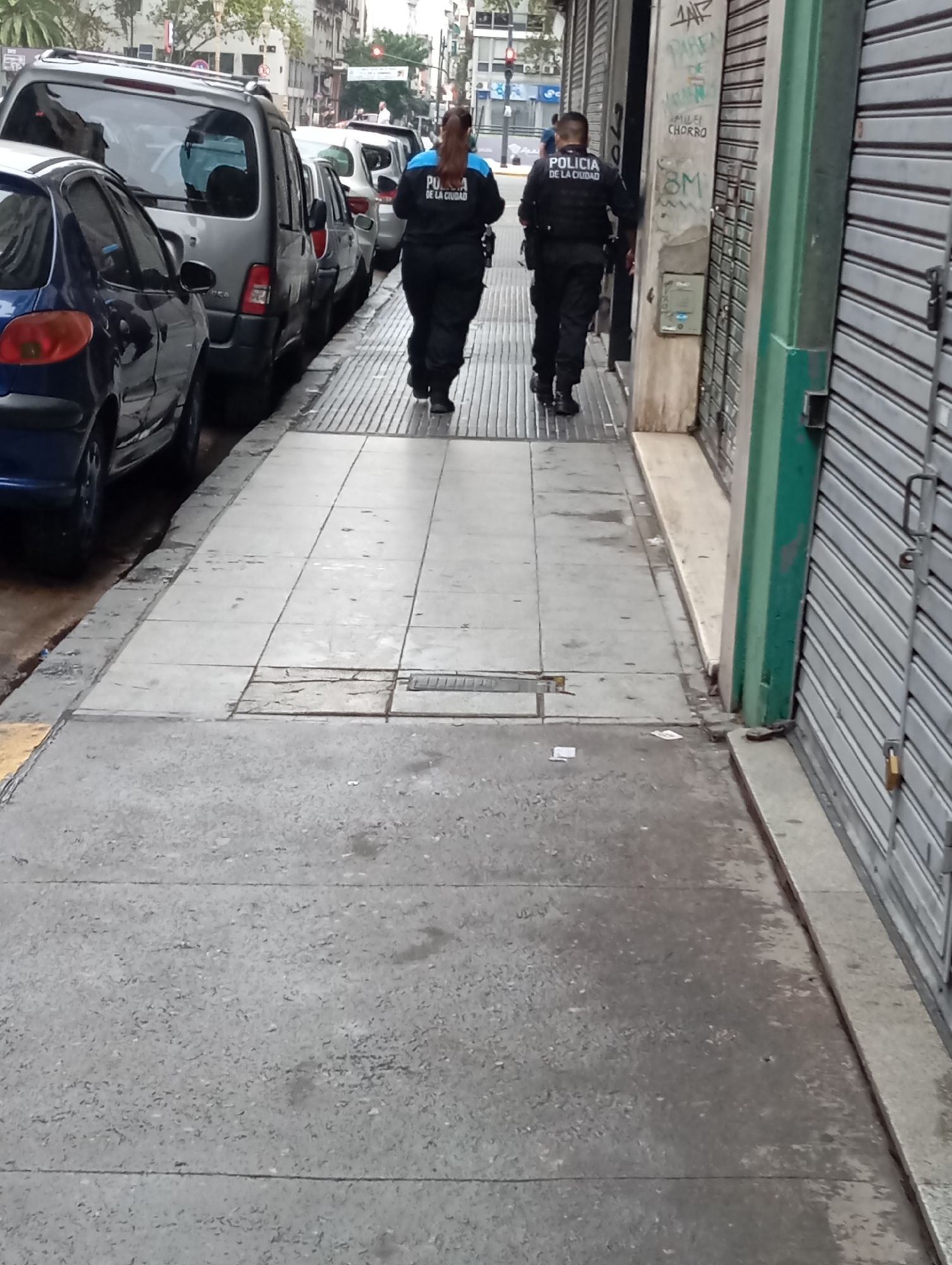 Two uniformed police officers from the Policía de la Ciudad are walking away from the viewer on a sidewalk in Buenos Aires, Argentina. They are walking on a paved sidewalk between parked cars and clos…read more