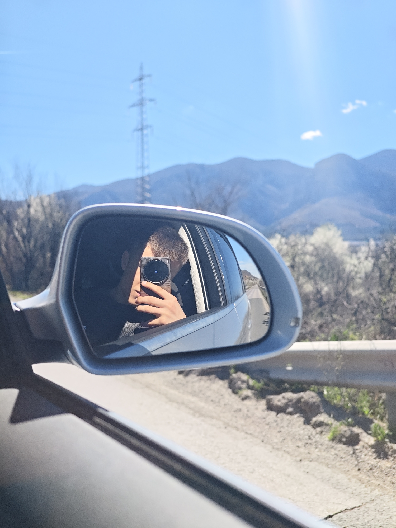 The image depicts a person taking a selfie in a car's side mirror. The reflection in the mirror shows the person holding a smartphone. Outside the car window, a landscape is visible, including mountai…read more