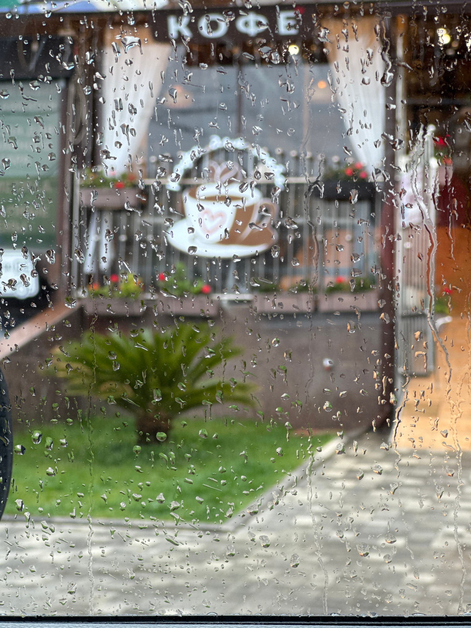 The image depicts a rain-streaked window looking out onto a street scene, possibly in Sochi, Russia. Focus is on a water-covered window, obscuring an urban setting outside. A blurry view through the wet glass reveals a street with greenery (a tree) and what appears to be an outdoor café or restaurant with furniture and signage. The word "KO" is visible on the signage. A pedestrian pavement is visible in the upper-right corner. The rain on the window creates a distorted and fragmented view of the scene. | Open Wire