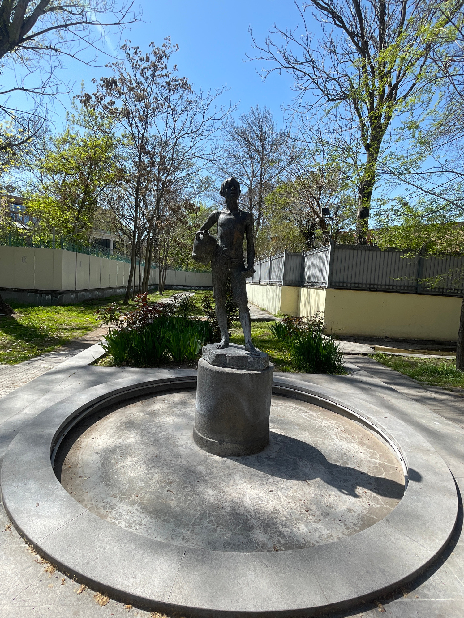The image depicts a bronze sculpture situated in a public space in Yerevan, Armenia. The sculpture portrays a standing male figure, slender and upright, positioned on a cylindrical plinth within a dry…read more