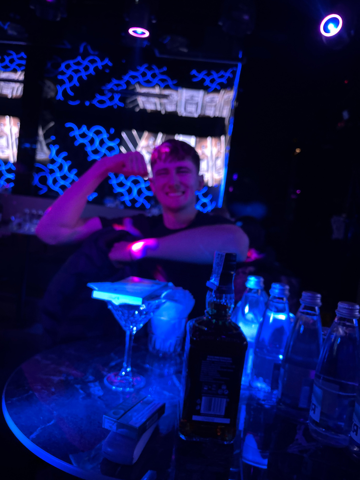 The scene depicts a person smiling with their fist raised, standing in what appears to be an indoor bar or club with a dark ambiance. The setting is illuminated with blue and purple lights. Behind the…read more