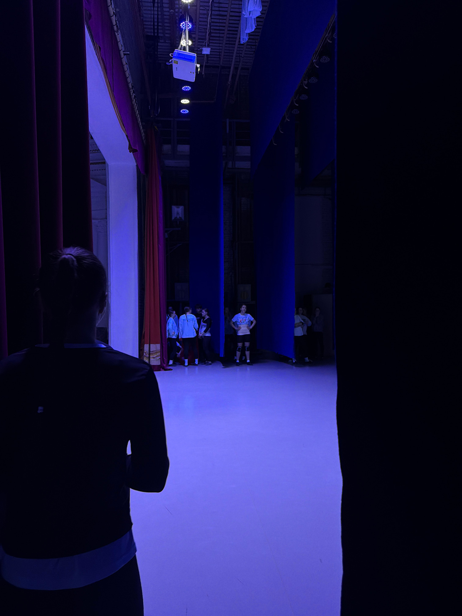This image captures a theatrical scene inside a performance venue in Perm, Russia, viewed from a raised audience perspective looking down towards the stage. The setting is predominantly dark, illumina…read more