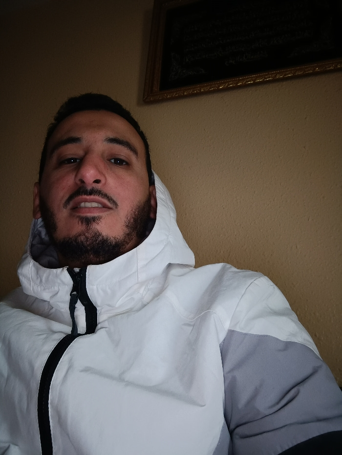 A selfie shows a man with dark hair and a beard. He wears a white and grey hooded jacket. The wall behind him is a muted beige color. A framed picture with dark content hangs in the upper right corner…read more