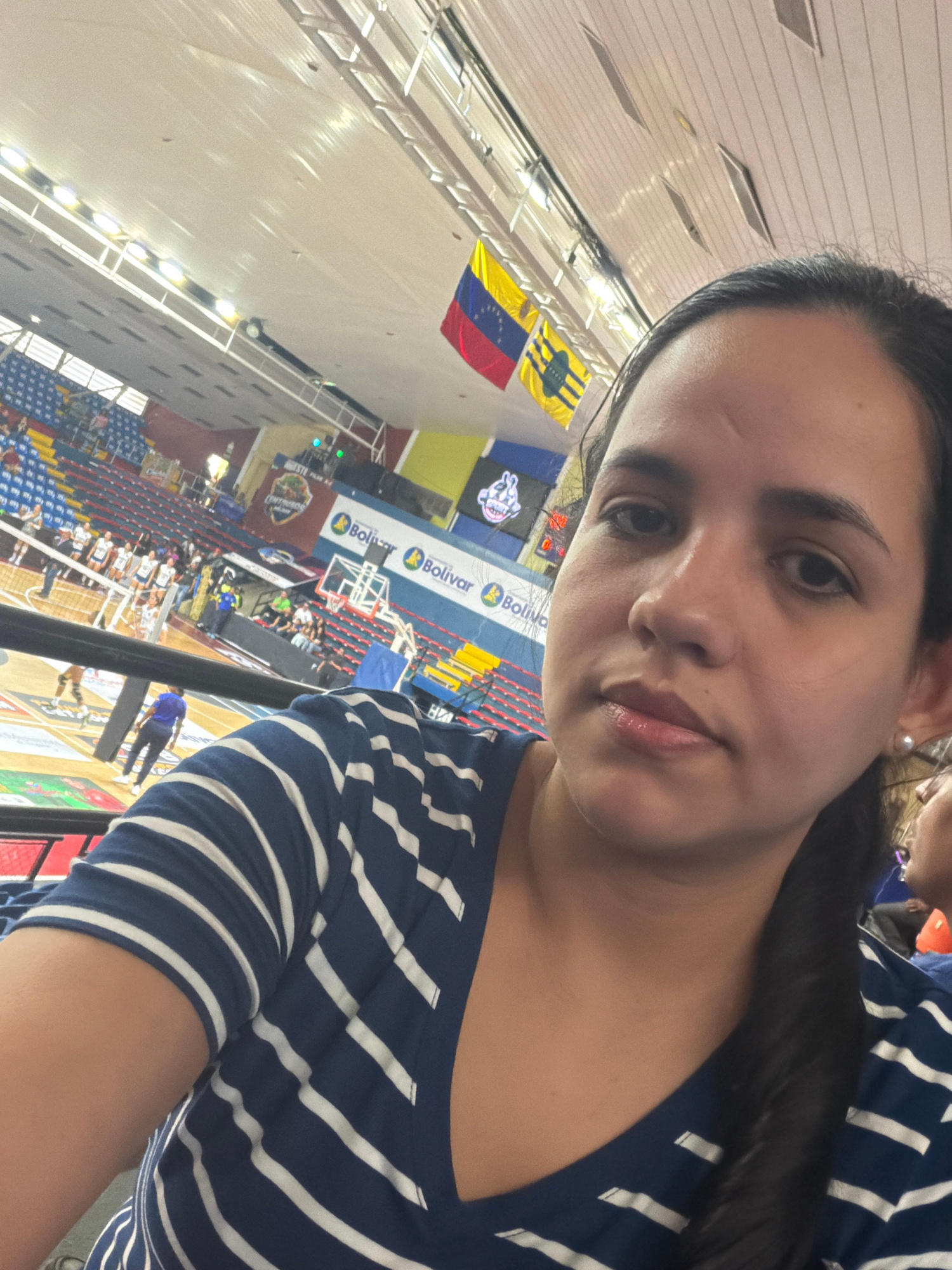 A woman is taking a selfie at a sporting event in Ciudad Guayana, Venezuela. The Venezuelan flag is visible in the background, along with banners with the text "Bolívar". The arena has red and blue se…read more