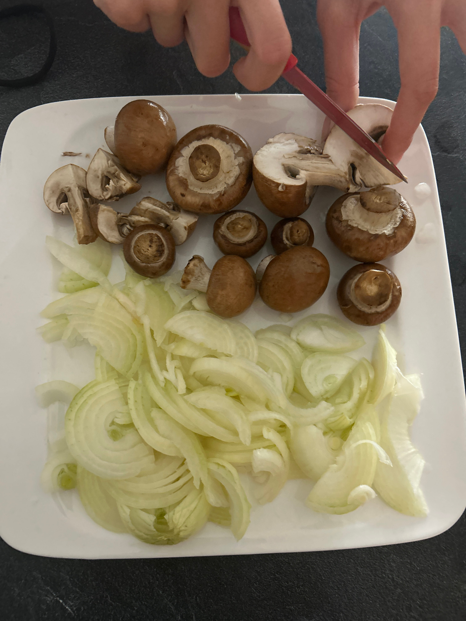 A white, square plate sits on a dark, possibly black countertop. The plate is divided into two sections. On the left are brown mushrooms, some whole and some sliced, being cut by a hand holding a knif…read more
